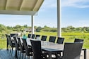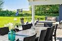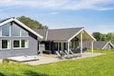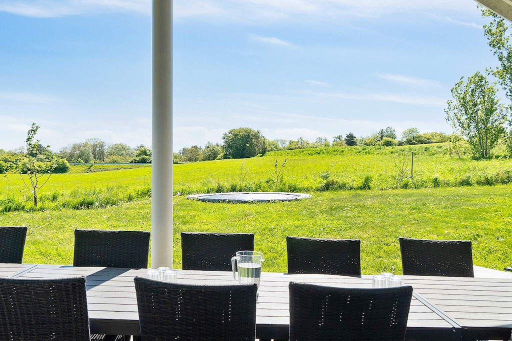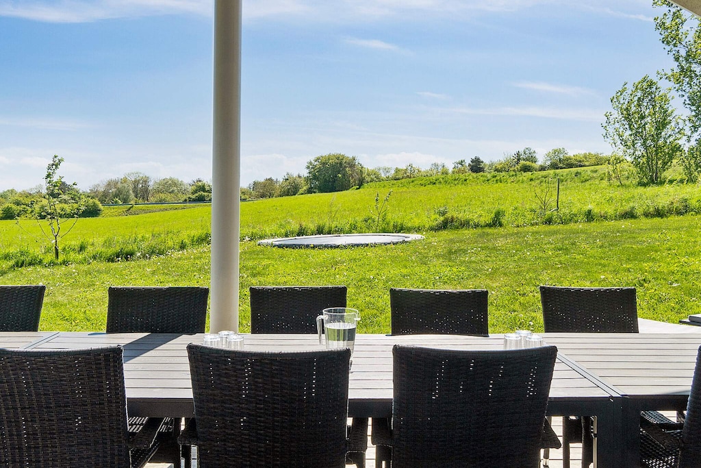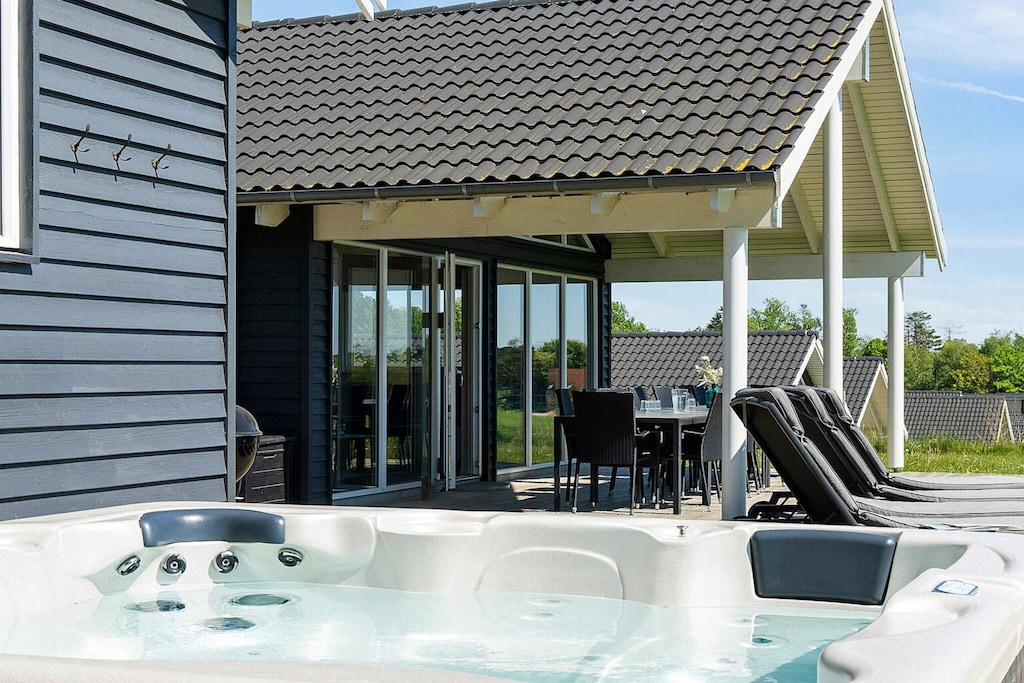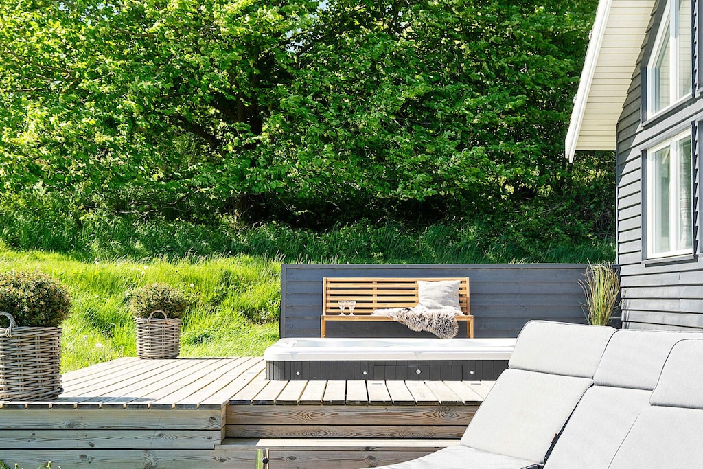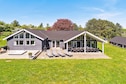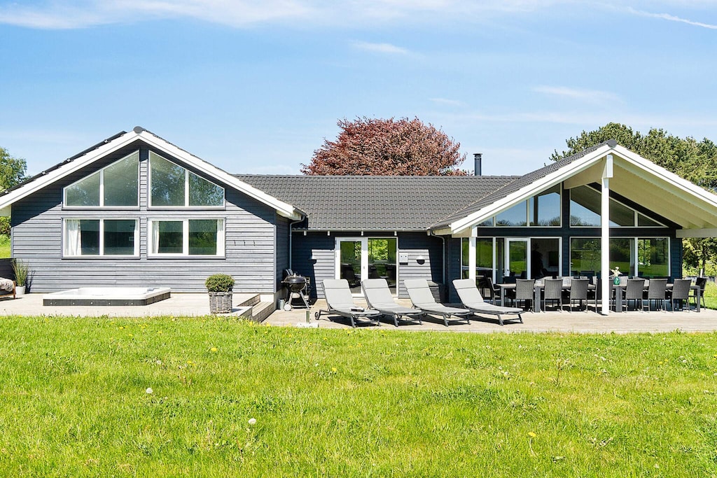 Well-furnished holiday cottage with swimming pool and activities with every amenity needed for an active holiday. The impressive pool room has an 18 m² large swimming pool with slide, counter-current system and a 4-6 people whirlpool as well as a large sauna. There is also an outdoor hot tub. The house is very spacious and built around 2 separate sleeping areas with bathrooms. There is also a large mezzanine which will undoubtedly be a hit with the children. The natural gathering point in the house is the large and architectural interesting room with combined kitchen and living room. The well-appointed kitchen has plenty of room for the various cooks. The tastefully furnished living room has comfortable furniture and a wood-burning stove as well as a large flatscreen-TV. On the other side of the centrally located living/dining room you will find the large activity room where you can play darts or pool or just relax in the sofa in front of the flatscreen-TV. There is a large, partially covered terrace where you can enjoy the Danish summer. On the large plot surrounding the house you will find swings and a sandpit for the children. No letting to youth groups. Please note: photos are taken from a similar house.