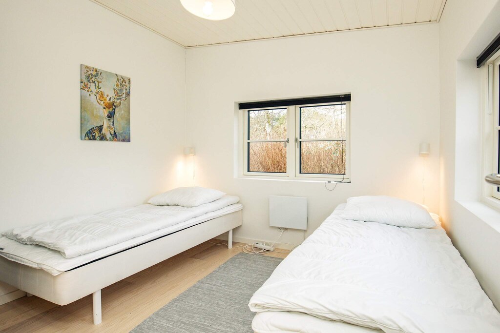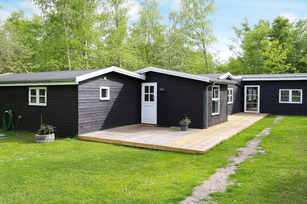 This vacation home is located in Vig at the end of a quiet cul-de-sac on a large natural property with the forest as its closest neighbor. It offers four bedrooms, two of which are located in the extension of the house built in 2021. The other two bedrooms are located near the bathroom. There is also an open-plan kitchen/living area with a dining and seating area for family life. The large windows of the room offer beautiful views of the surrounding nature and access to the large wooden terrace of the house, where you can enjoy the sun and meals of the day on the sun loungers. There is plenty of space on the property for ball games and other outdoor activities. For leisure and entertainment, the house also has Wi-Fi and a TV with a selection of German channels. There is a shelter for 3-4 people located at the back of the garden with a view of the forest. An outdoor electric sauna barrel for 4-5 people is also available. You will enjoy a peaceful stay here, yet only a few minutes' walk from a child-friendly sandy beach, ice cream parlors, restaurants, mini golf courses, and shopping facilities. Please bring your own firewood or purchase it at Dagligbrugsen Vig. Guests must remove their trash and waste before departure, including any pet waste (dog feces). No rentals to youth groups!A refundable deposit might be charged closer to your check-in date. The security deposit ensures a smooth stay and covers any additional services or consumption charges.This deposit covers utilities consumed during your stay and any additional services that may be taken.The final amount will be adjusted based on actual meter readings, actual usage of extra services, and any remaining balance will be refunded within 21 days after checkout.This deposit simply acts as a prepayment for charges that you would anyways pay for, ensuring a seamless stay and check-out experience.