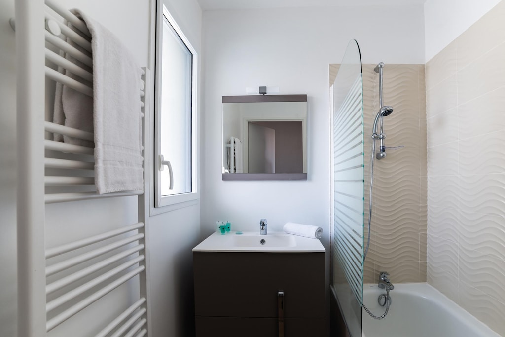 The apartment has a bedroom with a double bed, a cabin (sometimes closed) with a bunk bed and a bathroom with a bathtub.