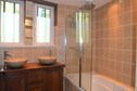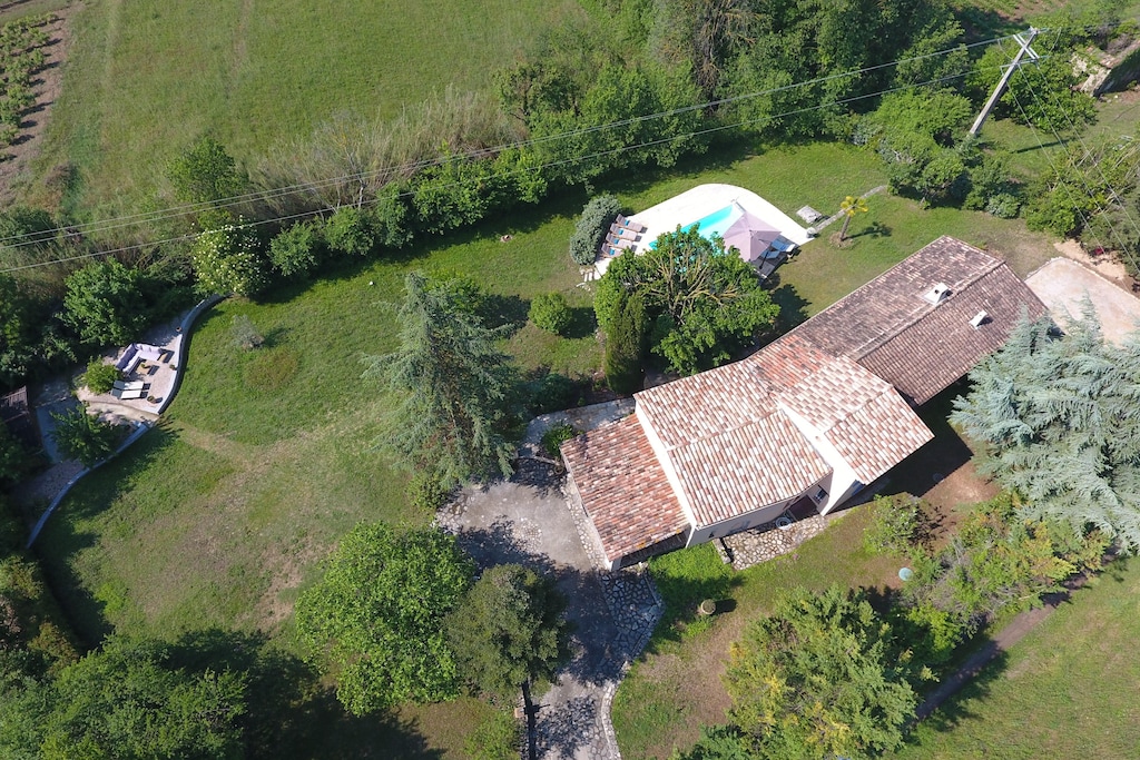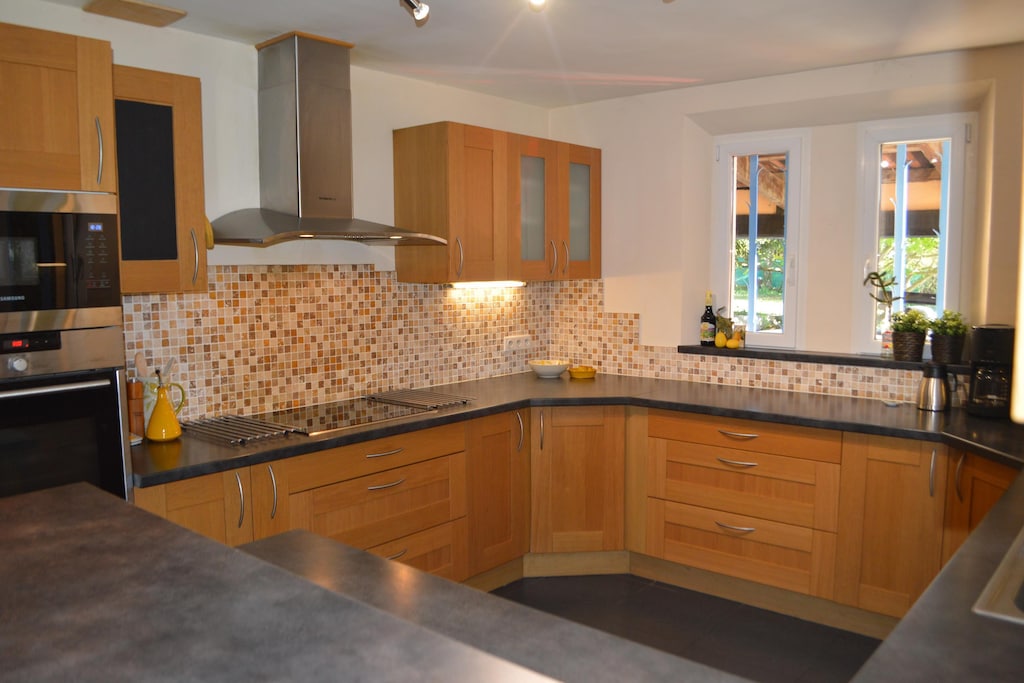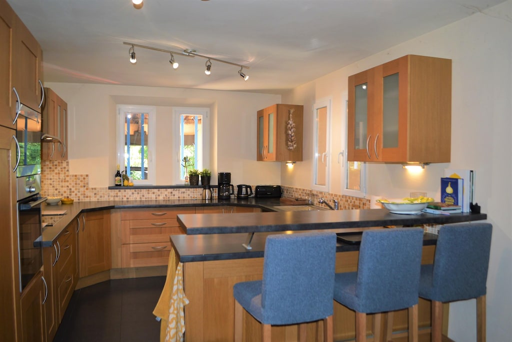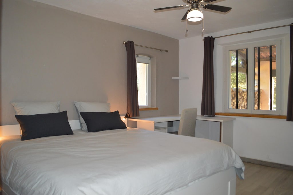 The enormous garden (3200 m²) surrounding the house is decorated with grass, a jeu de boules area, a swimming pool with terrace and a second covered terrace. It offers rich vegetation, with various flowers, herbs, palm, deciduous and pine trees, and plenty of space to play for the children. Under the covered terrace is an immense shiny table, taken from a yacht, with comfortable chairs and an electric Weber grill. Indoors you will find a well-equipped kitchen and a spacious living room with a striking ceiling that makes you feel like you are in a castle. The bedrooms have ceiling fans and windows with mosquito nets.