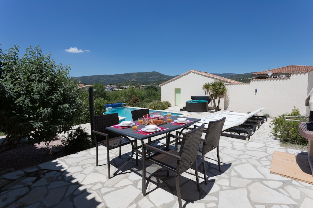 La villa est située au calme et possède tout le confort souhaite. La maison est très bien équipée avec une piscine privée et un spa à l'extérieur. Très belle terrasse avec une très belle vue.