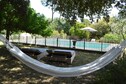 The outdoor environment is characterized by a cozy lounge area with wooden furniture and cushions, a hammock, a terrace with dining table covered by vines and a large swimming pool. The swimming pool is fenced and measures 12 by 6 meters with a depth ranging from 1 to 2.5 meters. Long steps in the pool ensure easy entry and exit. Around the pool there are single and double sun loungers and a parasol.
