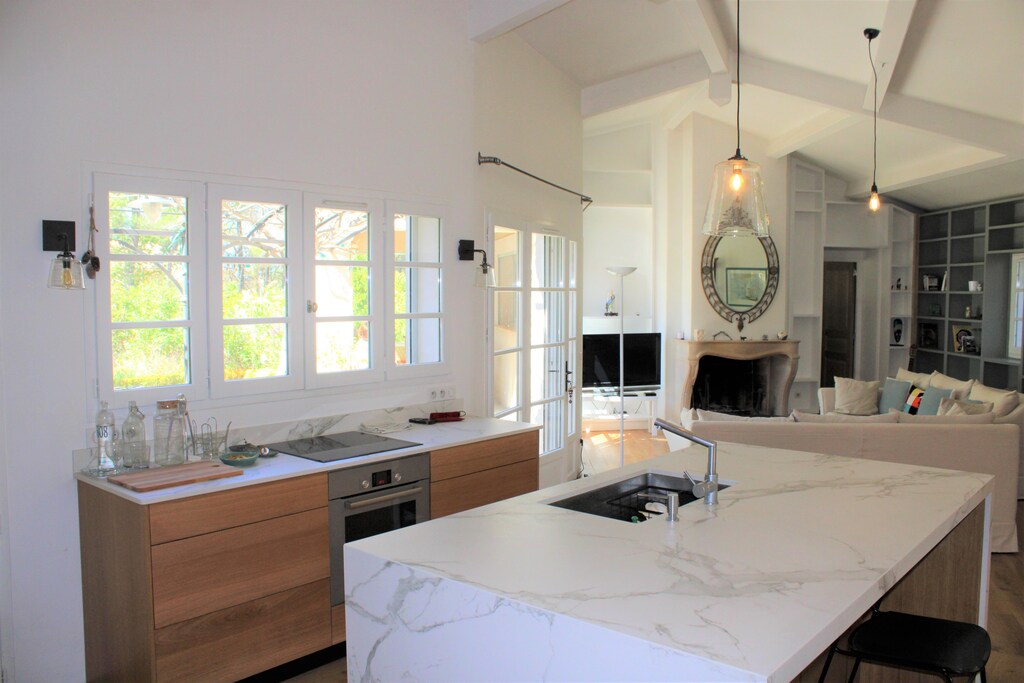 When you enter the house, you reach the attractive living room and the well-equipped kitchen with central cooking island and a spacious breakfast table. The whole house has an electric shutter system to keep the heat out and to darken the rooms. Outside you will find several covered terraces, a spacious dining table, a gas barbecue, an attractive lounge area, and a large swimming pool surrounded by plenty of sun loungers and parasols.
