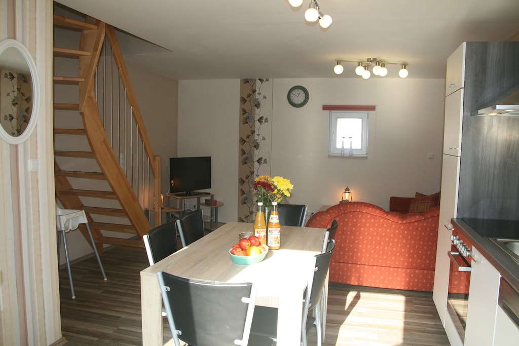 The half-detached house has its entrance and can accommodate a maximum of 6 people. The ground floor houses the living area with a well-equipped kitchenette and a guest toilet. The upper floor has 2 bedrooms and a bathroom with a shower and toilet. The half-detached house has its own sun terrace with garden furniture and a barbecue. A shared children's playground is located directly next to the house. The shared playground is located at the host's neighboring country house. Here, guests' children can play and romp to their heart's content._x000D_