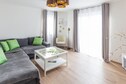 This luxurious ground-floor holiday flat in Beilngries offers couples a serene retreat with a private terrace and garden, perfect for unwinding in nature. The open-plan living space features a modern kitchen, cozy seating, and a spacious sofa, creating a warm and inviting atmosphere.