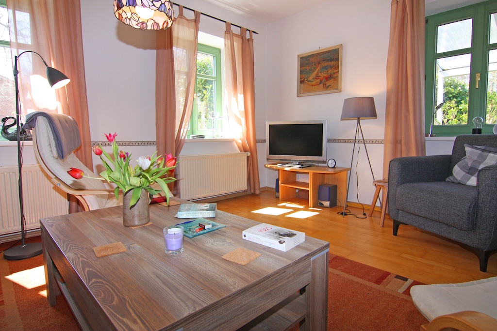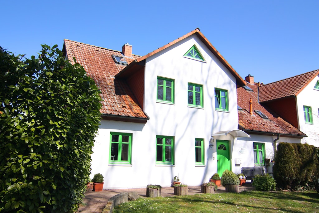 The quiet and sunny apartment complex with a secluded garden is located in rural surroundings between Wiek and Breege. You've come to the right place if you're looking for rest and relaxation. The house has been lovingly remodeled and lacks no convenience. The garden with barbecue and outdoor fireplace invites you to linger. Enjoy the sun or a barbecue evening together. Only a short walk away from the Breetzer Bodden, you can spend your holiday in the middle of nature. During a holiday in the modern, cozy apartments you will experience pure relaxation in combination with bathing fun on the most beautiful beach in the Baltic Sea. Due to the local conditions, the holiday property is perfect for family reunions or couples of friends. The so-called Schaabe is a spit several kilometers long with very finely washed up sand and a coastal protection forest between the towns of Breege and Glowe.Highlights included: Usage-based energy costs, bed linen, towels, final cleaningWLAN tourist taxParking areaActivities nearby: In summer it is possible to take ferry trips from the port to the Hiddensee Island and to the Störtebeker Festival in Ralswiek, as well as going on excursions or spending a relaxing day fishing on the Bodden. In winter, the Bodden offers the best conditions for skating on the mostly mirror-smooth ice sheet.