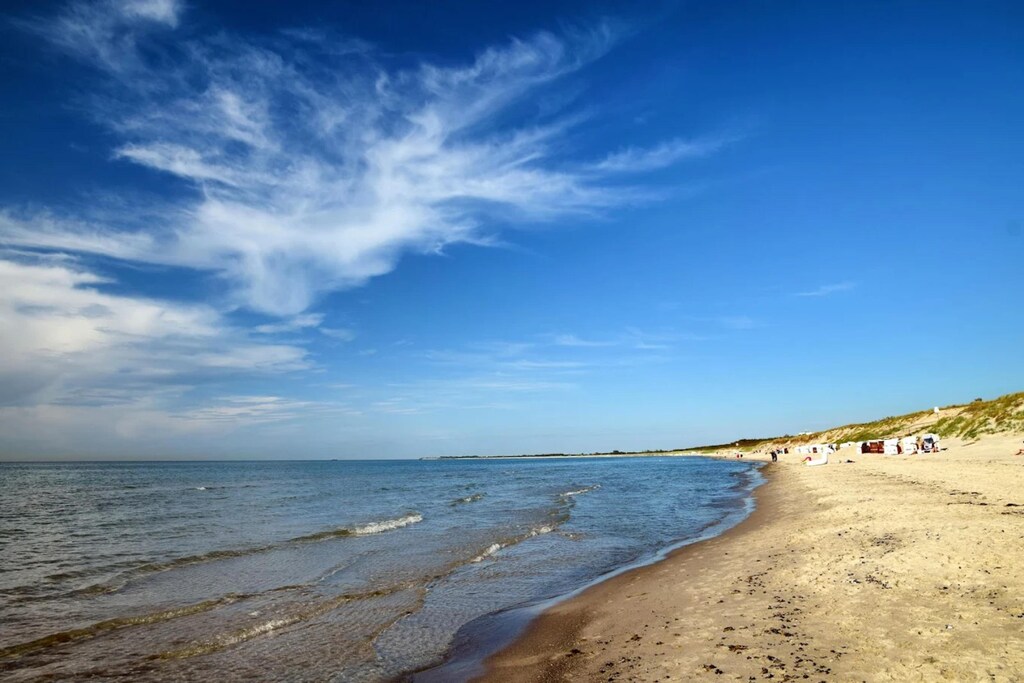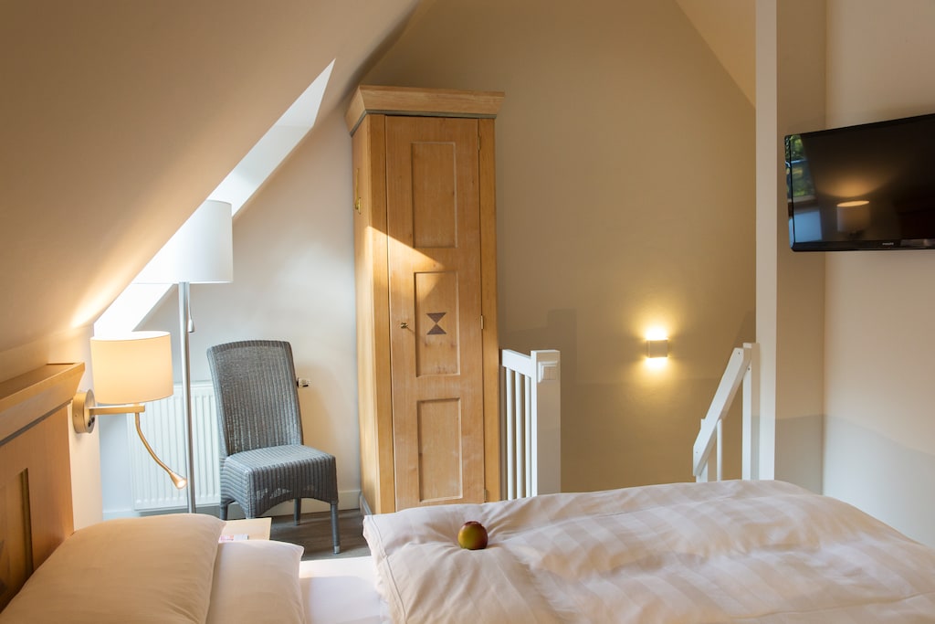 The stylishly furnished living and sleeping area with a kitchenette offers space for a dining area. One bedroom is located on the living level, as a separate room. Access to the shower or bathtub is directly in the entrance area. The second bedroom with an en-suite bathroom is located in the attic and is accessible via a staircase in the living room.