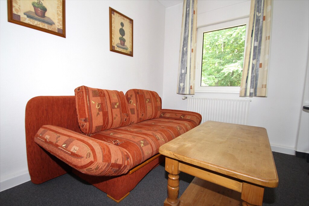 The accommodation is located on the ground floor and offers an open kitchen equipped with a stove, kettle, toaster, coffee machine, oven and fridge. The living and dining area has a single sofa bed, ideal for additional guests. The bedroom is furnished with a double bed or two single beds. The bathroom has a shower, sink and toilet.