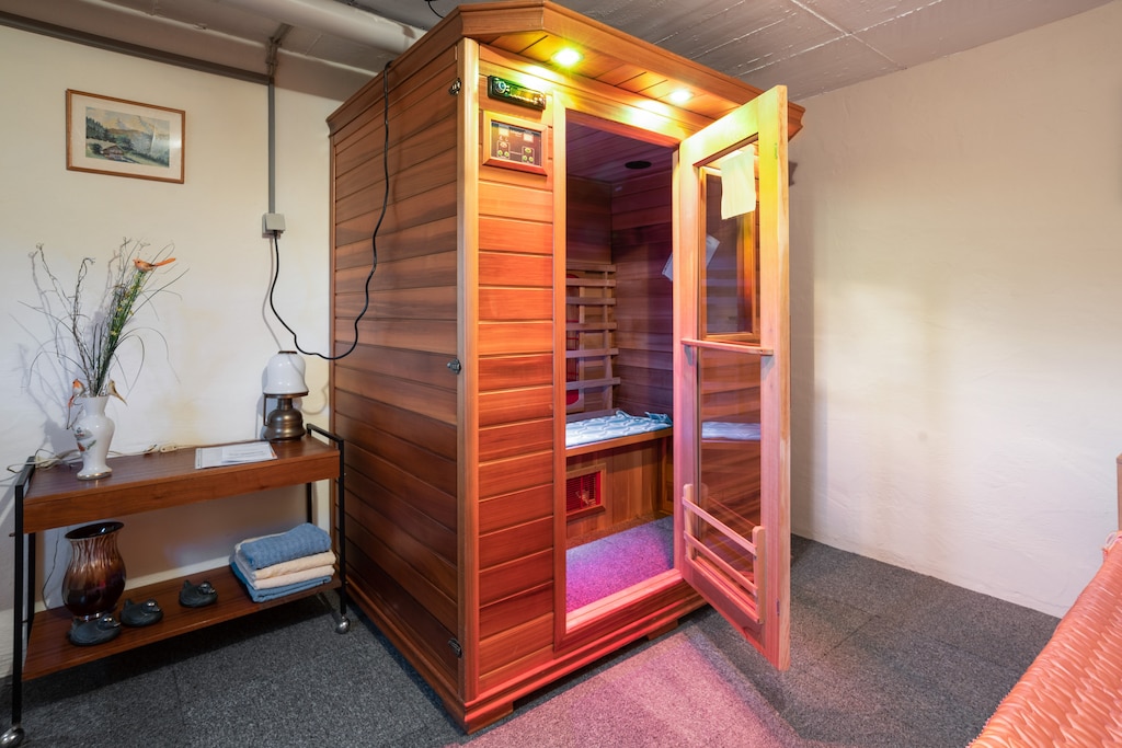 In the basement, enjoy a recreation room with table tennis, a bike storage area, a washing machine, and an extra shower. A private sauna is available on request for added comfort. The garden with barbecue is perfect for unwinding after a day of exploring.