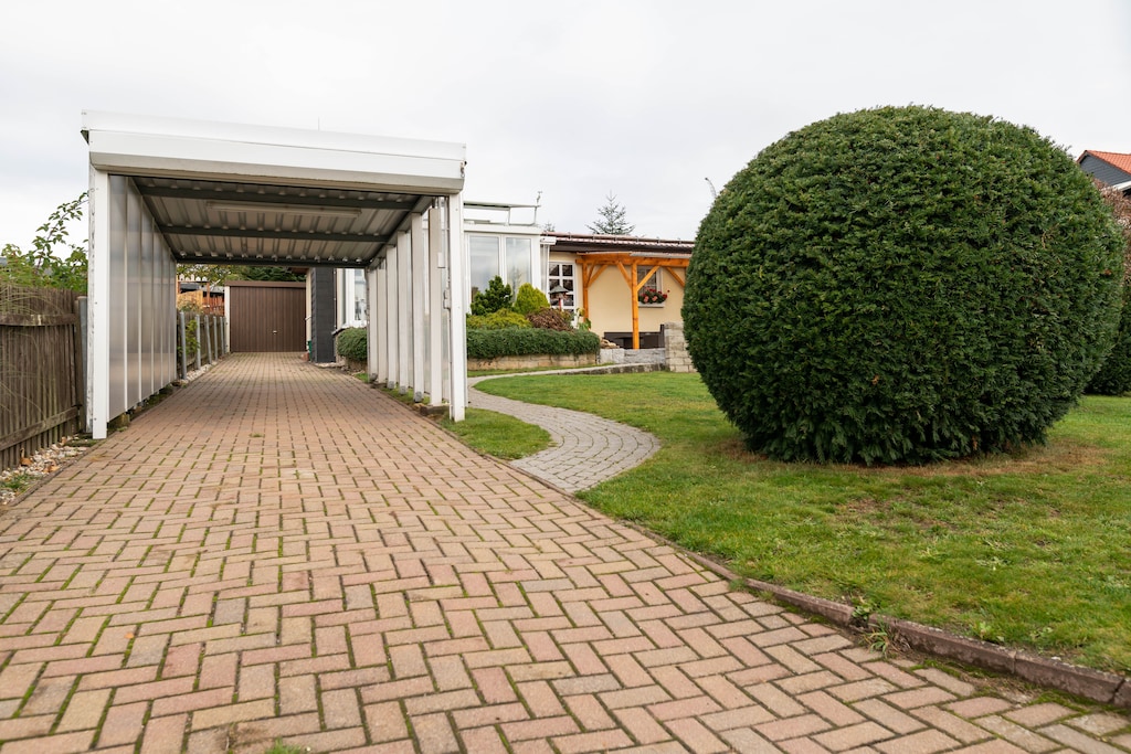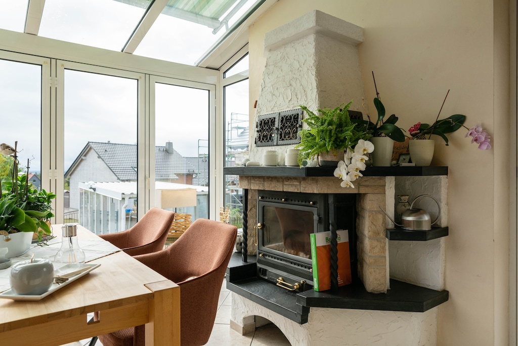 The standout feature is the conservatory with a fireplace, TV, and dining table—perfect for warm gatherings year-round. Step outside to enjoy the fenced private garden (400 m²), furnished terrace, sun loungers, electric/charcoal BBQs, party games, and shaded seating under a parasol. With central and underfloor heating throughout, plus garage, carport, and bicycle storage, every convenience is covered.