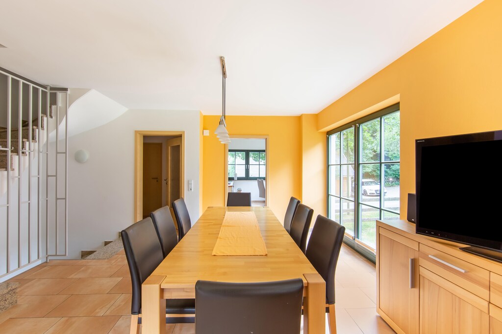This versatile holiday home in Friedrichshöhe features a semi-detached layout with a connected granny flat, making it ideal for multiple families or groups. A sliding wooden wall separates the spaces, providing privacy while still allowing everyone to gather in the large living area. With several bedrooms, multiple bathrooms, and cozy living spaces with fireplaces, the home offers comfort for up to 15 guests. The open kitchens and dining areas make group meals easy and enjoyable, and children can entertain themselves with table football while adults relax.