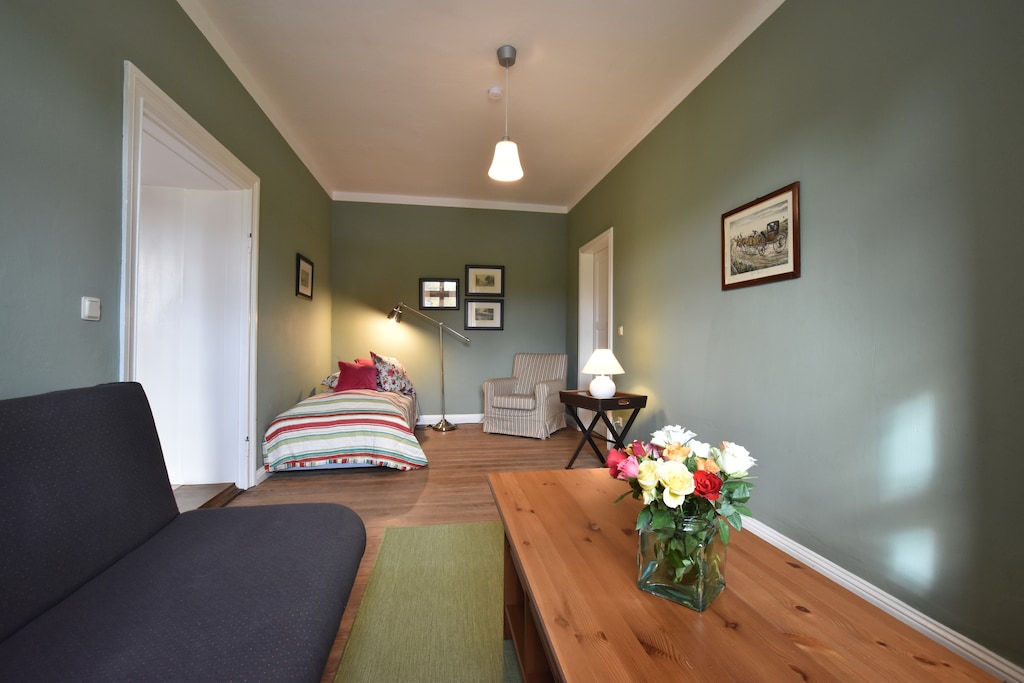 Children will love the shared sandpit and swings, while adults can enjoy coffee on the terrace or a quiet afternoon in the garden. Indoor heating ensures a comfortable stay even during cooler months. Parking is available on-site, and the friendly homeowner lives in the same building, always nearby if you need anything.