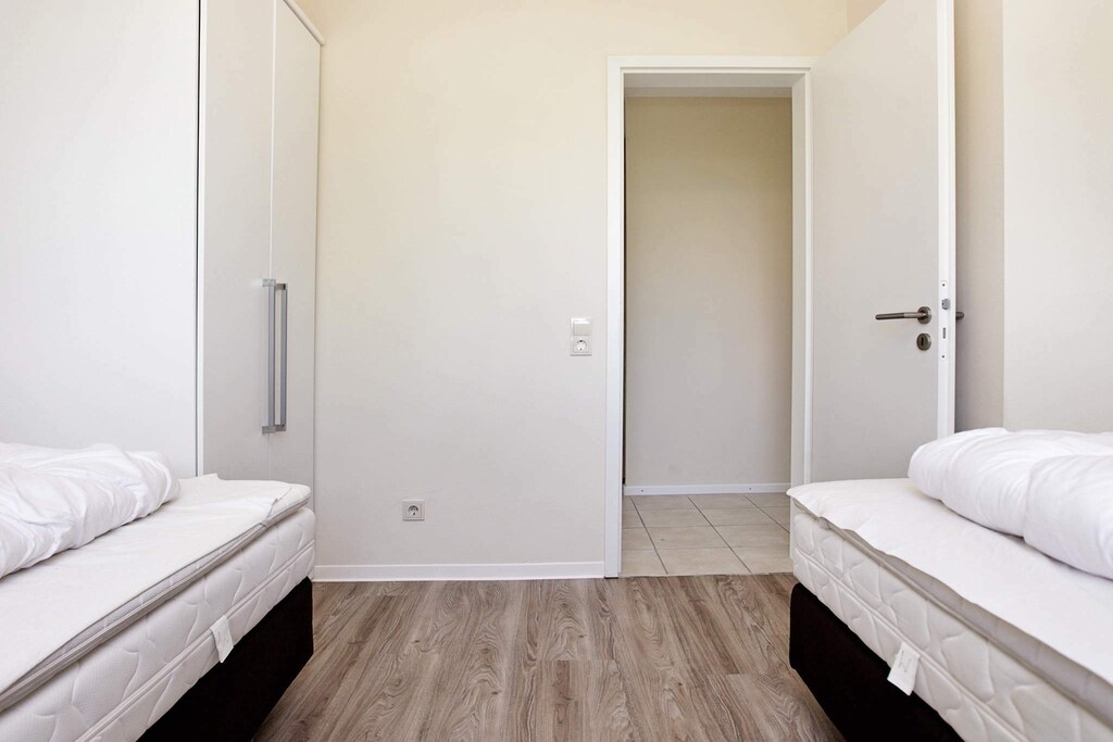 These holiday apartments are located on the 2nd floor of the modern Ostseeapartments apartment building at Fehmarnsund in Ostseeheilbad Großenbrode on the northern tip of Lübecker Bay. The apartments are tastefully decorated and invite you to relax all year round. In addition to the sofa bed in the living room with two beds and two bedrooms, there is also an open living room / kitchen area with i.a. microwave, dishwasher, satellite TV and DVD and CD player. From here there is access to the balcony, where you can enjoy the view of the surroundings and the Baltic Sea. However, the view is limited depending on the season. In Großenbrode you will find a beautiful, 1.5 km long south beach with fine, white sand. Here you can enjoy the sunny moments in the beach baskets and watch the children playing at the water's edge. In addition to the glorious beach, where children can play, and the Baltic Sea to splash in, there are several activities for fun. On the beach is the large pirate ship & quot; Grobi & quot ;, and you will also find a mini golf course and skate park close to the south beach. For a culinary break, you can stroll down the 1.5 km long promenade with cozy restaurants, ice cream parlors, cafes and various shops. With only approx. 150 m to the beach and the promenade, the apartment is a perfect starting point for wonderful beach holidays as well as the opportunity to explore the scenic area. After an active day in nature with many experiences, you can end the day in the whirlpool or sauna and recharge for the next day's experiences. Close to the apartment you will find the Fehmarnsund Bridge and the amusement park Hansapark. As the apartment is part of a series of similar apartments, the decor may vary. There is a parking space for one car at the apartment. If you have several cars with you, they can be parked at the reception.