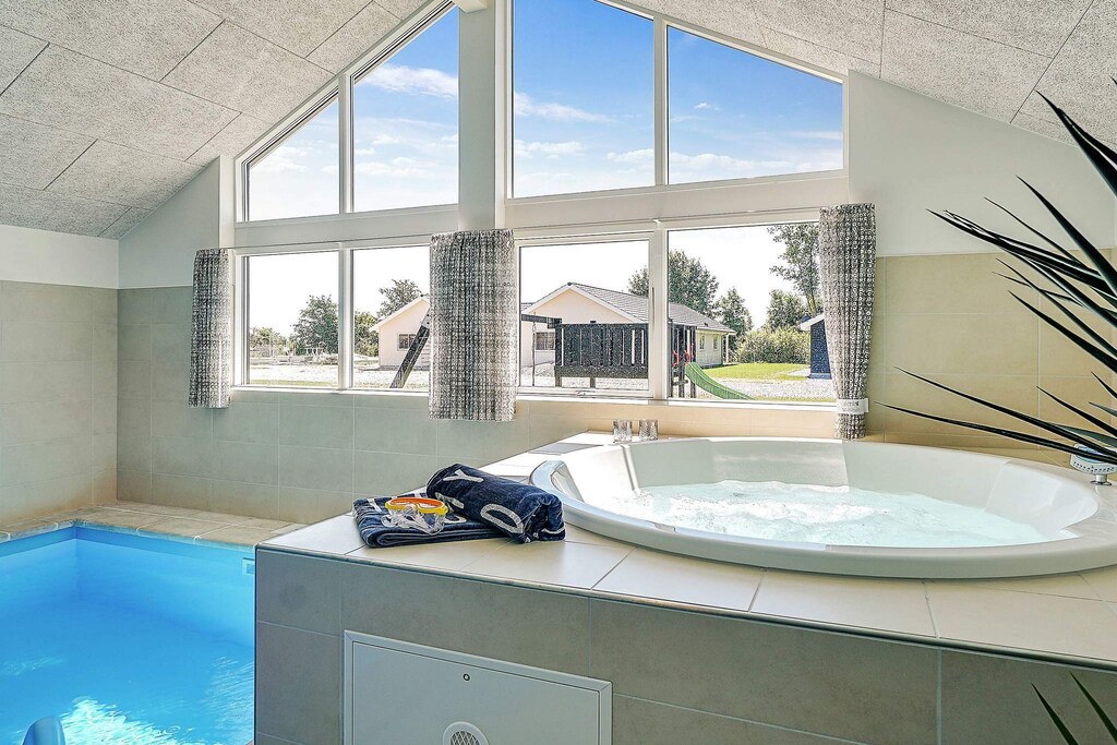 In this activity and wellness cottage you can enjoy the 18 m2 large swimming pool with counter-current system and water slide right from the morning. Afterwards, you can relax in the hot tub and sauna and recharge your body. Ready for today's challenges, you can have breakfast in the well-equipped kitchen with the large dining table with space for the whole family. The stove provides comfortable heat on cool days. You can of course also enjoy it in the sofa corner in front of the television. Next to the kitchen-living room you will find the activity room with billiard table, table football, table tennis, dart board and PlayStation4, which both young and old can enjoy. In continuation of the activity room, which is also equipped with a bar with a refrigerator, you will find three bedrooms and a bathroom. The other three bedrooms as well as a bathroom are located by the entrance hall and then there is an additional bathroom in the pool room. The single beds can be pushed together into a double bed. The loft with four mattresses and TV will especially the older children will enjoy. On the plot that surrounds the house, the smallest guests with a swing, slide and sandbox have been considered. Due to the size of the house, the price of this Skanlux cottage differs from the normal list price. Please note that the operation of the pool as well as the use of the counter-current system, the sauna and the spa entails an increased consumption of electricity and water. Depending on the season and use, a consumption of approx. 20 & # 8211; 30 Euro per day. *** Some houses are still being built in the area and close to the house. Therefore, there may occasionally be building nuisances such as. noise and dust. *** *** Important information: The deposit must be paid to our service partner on account IBAN: DE58 2175 0000 0165 3631 28, BIC: NOLADE21NOS. Remember to state your booking number. *** Not for rent to youth groups.