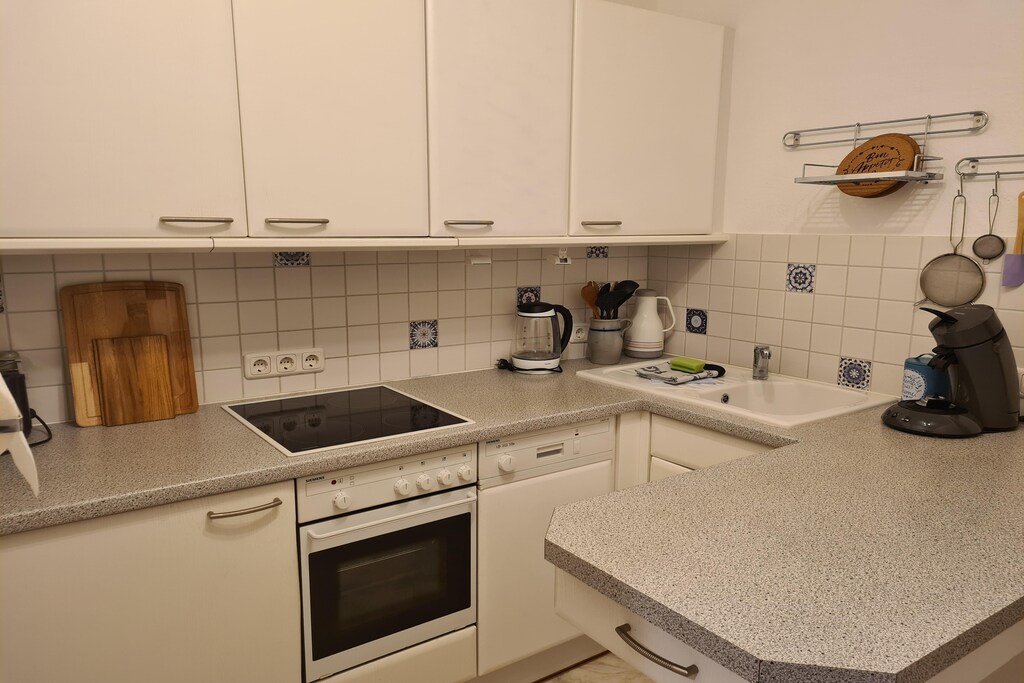 Set in the quiet village of Krusenhagen, just 7 km from the historic port town of Wismar, this bright and practical 1st-floor apartment is ideal for families seeking a peaceful coastal escape. The living room offers a cozy seating area, dining table, and TV, while the well-equipped kitchen features electric hot plates, oven, pad coffee machine, combination microwave, toaster, and dishwasher—perfect for easy home-cooked meals.