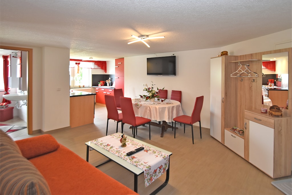 Located in the peaceful village of Lichtenhain, near Sebnitz, this spacious ground-floor apartment is perfect for up to 6 guests. With two bedrooms—one with a double bed, the other with a double bed (180 x 200 cm) and bunk bed—it’s ideal for families or small groups.