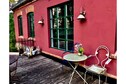 The home features a compact open kitchen with a coffee machine, fridge-freezer, and two-ring stove, perfect for preparing simple meals. The living/bedroom includes a double trundle bed and a dining table for two, while the bathroom is equipped with a shower and toilet. Heating ensures comfort year-round, and a high chair is available for added convenience. Outdoors, guests can relax on the terrace or in the garden, complete with furniture and private parking.