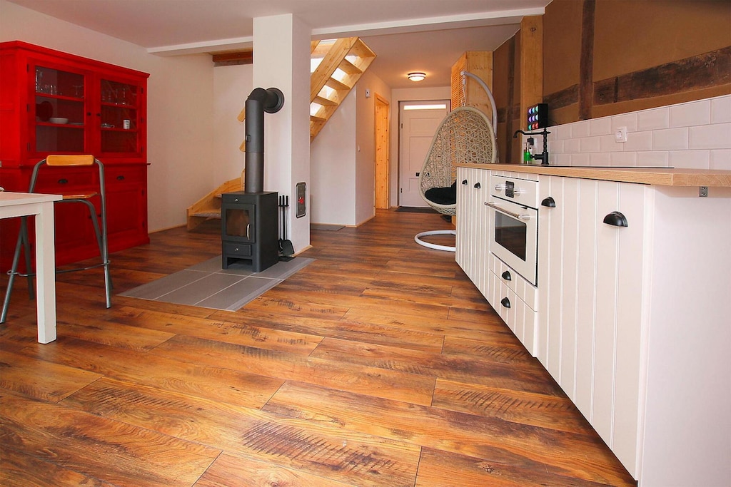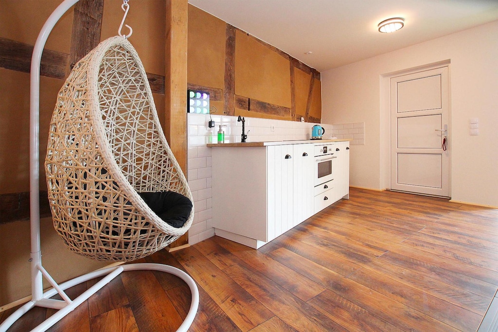 Vacation in the smallest house in Neukalen: Lovingly renovated half-timbered house in a small side street in Neukalen, a small town on the Peene. Your holiday home is modernly furnished and perfect for couples looking for a break together. Neukalen is located directly on the beautiful river Peene, which flows just a few kilometers further into Lake Kummerow. The small town was first mentioned as Altkalen in 1174 and has been called Neukalen since 1306. Accordingly, you will find historical sights such as the circular settlement planning in the old town or the parish church of St. John from the year 1318. There are various restaurants and inns to stop off and also plenty of shopping opportunities for self-sufficiency.Highlights included: Usage-based energy costs, bed linen, towels and final cleaningWLAN activities in nearby: Bring your bikes and enjoy the approximately four-hour bike ride around Lake Kummerow. You will not only discover the charm of the slightly hilly landscape of Mecklenburg Switzerland. Be sure to also take a break in Malchin. In addition to the beautiful market square and the remarkable German avenue, numerous monuments, churches and a museum await you. Fans of canoe and kayak tours should do a tour on the Peene, here every holidaymaker goes into raptures when they can explore the mostly untouched nature from the water.