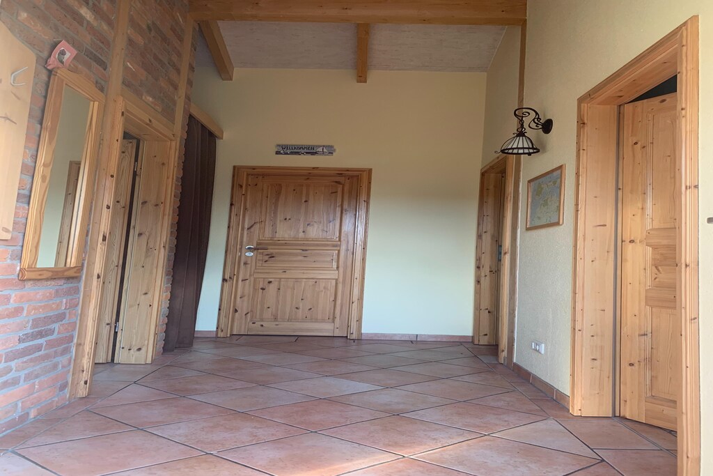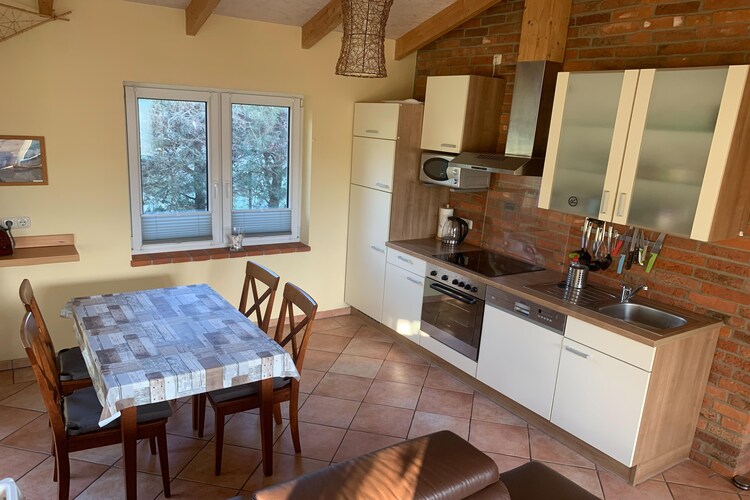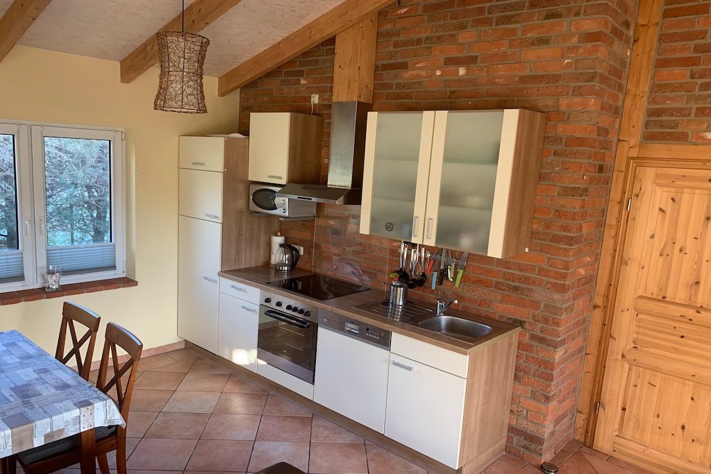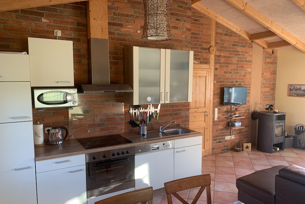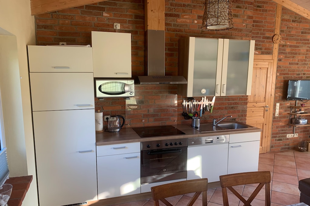 The open kitchen is fully equipped with a coffee machine, oven, microwave, dishwasher, and fridge-freezer—perfect for preparing meals with local ingredients from Barth’s nearby markets (5 km). Sleeping arrangements include a spacious double bedroom and a second bedroom with two single beds plus a child’s bed, ideal for a group or young family. A modern bathroom with a walk-in shower completes the interior.