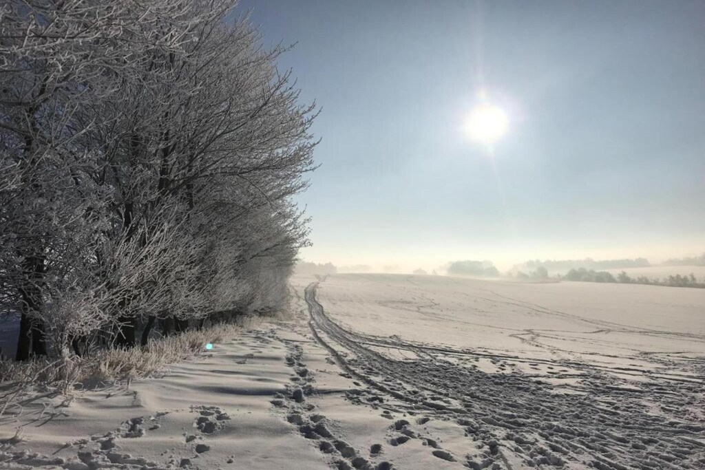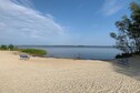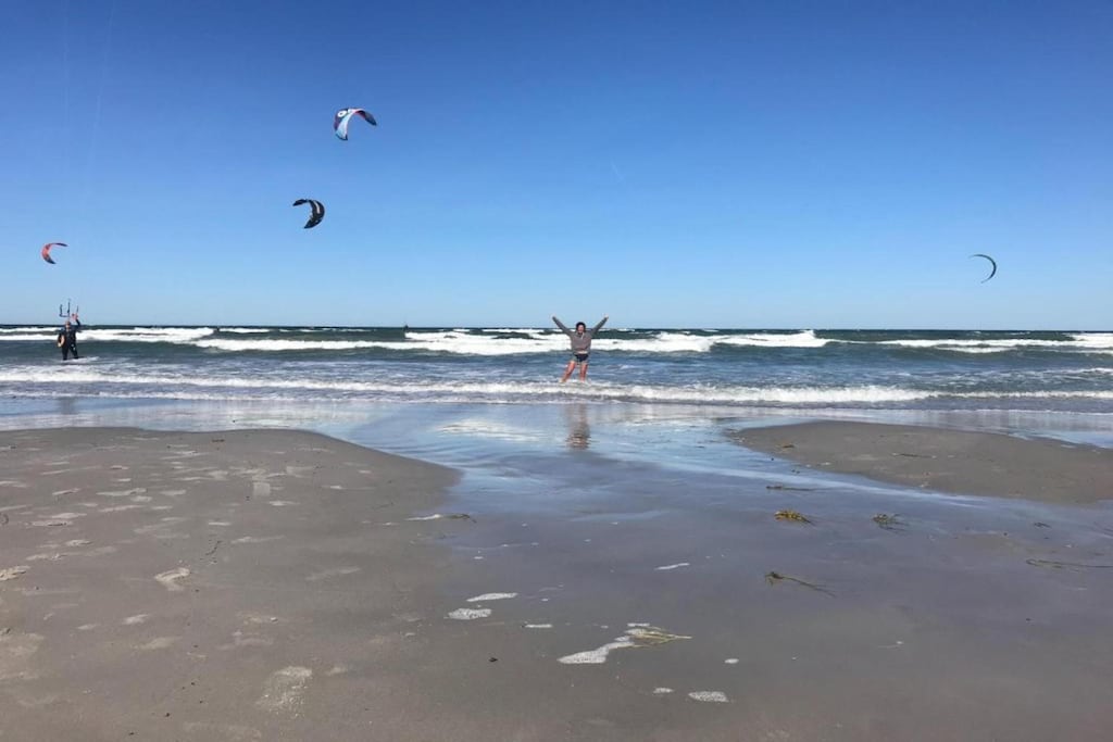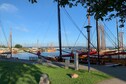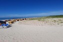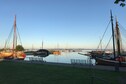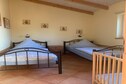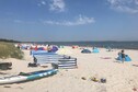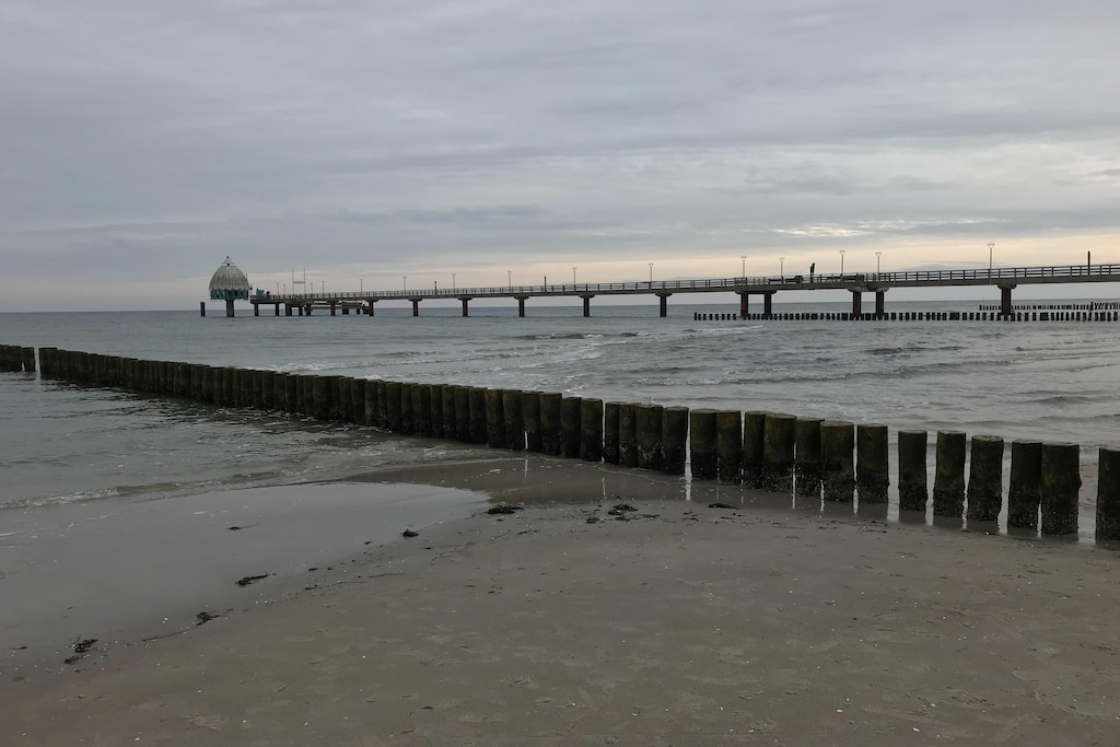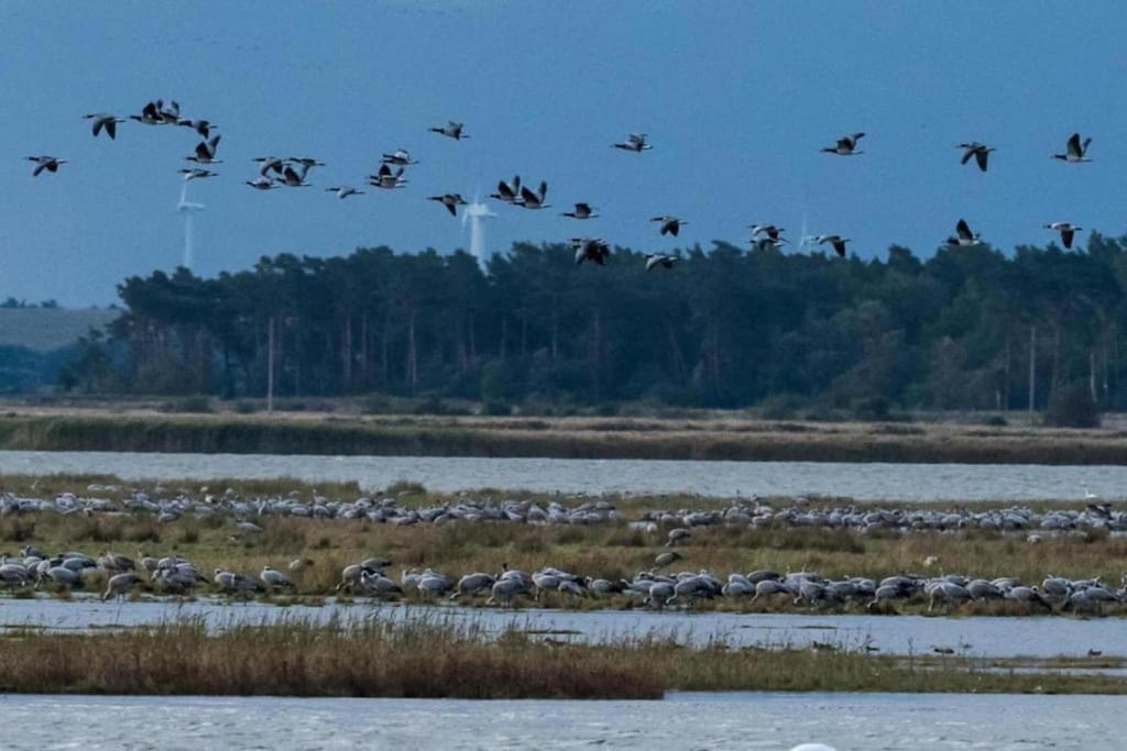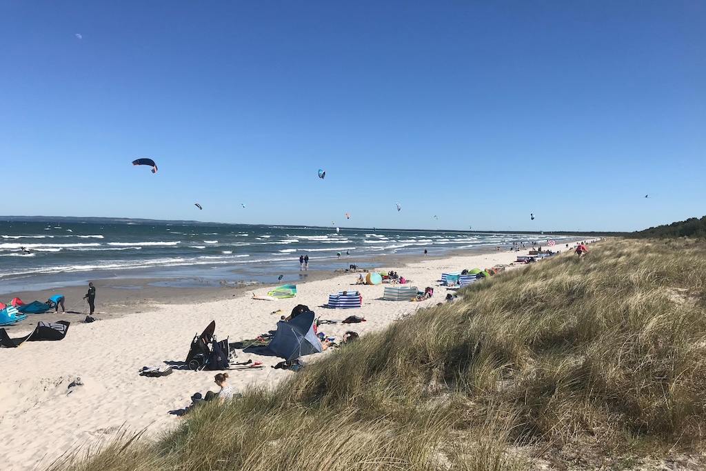 The open kitchen is fully equipped with a coffee machine, oven, microwave, dishwasher, and fridge-freezer—perfect for preparing meals with local ingredients from Barth’s nearby markets (5 km). Sleeping arrangements include a spacious double bedroom and a second bedroom with two single beds plus a child’s bed, ideal for a group or young family. A modern bathroom with a walk-in shower completes the interior.