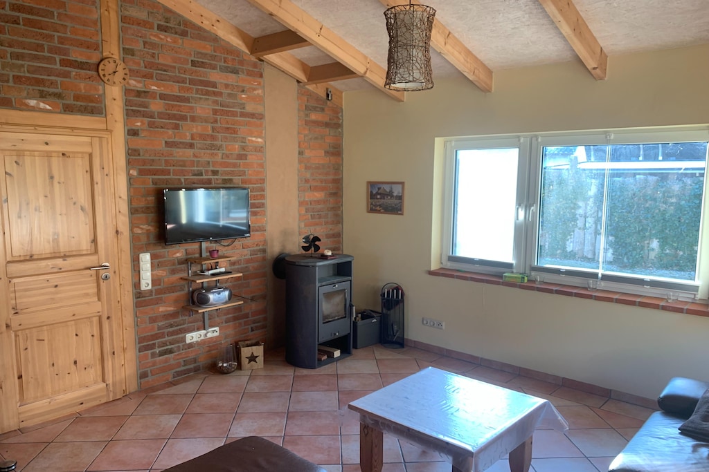 Ideal for Families & Nature Lovers Located just 1.5 km from the quiet shores of Bodstedter Bodden and Pruchten’s bathing beach, this ground-floor holiday home is designed for families seeking a cozy escape surrounded by nature and water. The inviting living room features a fireplace, satellite TV, and a dining area for relaxed evenings after your coastal outings.
