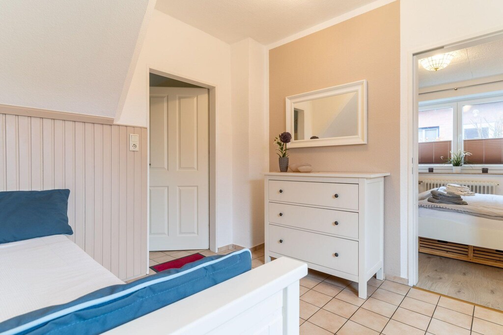 Lägenheten var mysig och välutrustad, Vi uppskattade särskilt den separata toaletten från duschrummet, vilket gjorde våra morgnar lite lättare, Värdarna var vänliga och området var perfekt för att utforska lokala attraktioner som Westerheversand fyrtornet