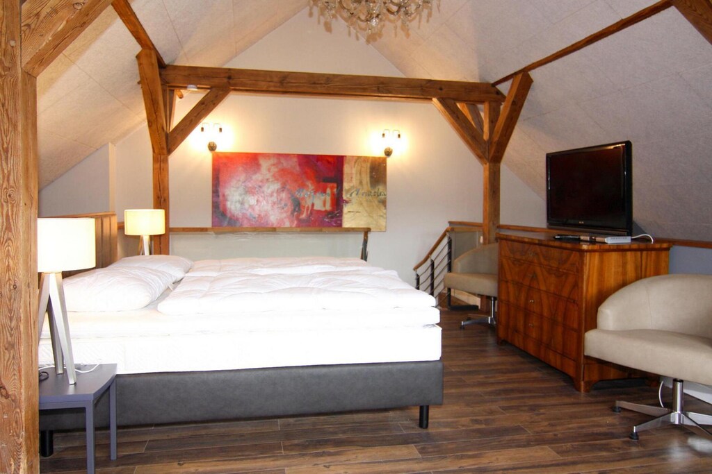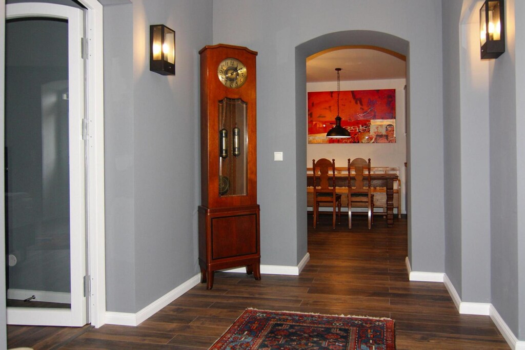 Exclusive holiday home with WiFi for up to 8 people on a hillside on the grounds of the Schlosshotel Wendorf near Schwerin. With 289 square meters of living space and extremely comfortable and stylish furnishings, the domicile is a true oasis of well-being. The house consists of 3 self-contained residential units, each with separate entrances. Breakfast and dinner can be taken for a fee in the Schlosshotel, which is only 100 meters away. You can also improve your handicap on the nearby golf course. At the foot of the castle park there is a professional riding facility. The five-star castle hotel Wendorf is only a few kilometers away from Schwerin. Surrounded by the charming landscape of the Mecklenburg Lake District, you have the opportunity to discover art and culture in the state capital as well as to actively explore the beautiful natural landscapes The WINSTONgolf golf course, which is only a 10-minute drive away, is one of the most attractive golf courses in all of Europe. As a guest of the Schlosshotel, you receive discounted green fees for the three courses in the facility. But the area around the Schlosshotel also offers many opportunities for outdoor activities. The region is perfect for extensive bike tours or enjoyable walks and hikes. Excursions to Schwerin and Rostock or a day at the beach on the Baltic Sea are very easy to do from here.