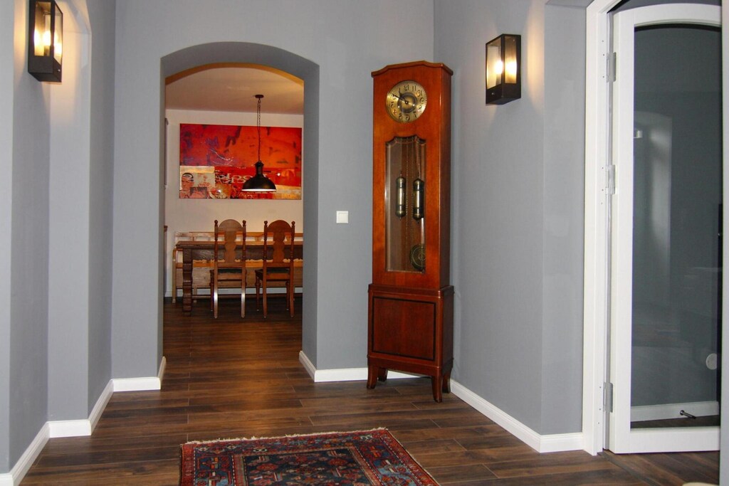 Dining table, Hob (induction, 4 ring stoves), Electric kettle, Toaster, Coffee machine (filter), Oven, Dishwasher, Fridge-freezer