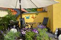 The apartment features a warm living room with a wood stove, flatscreen satellite TV, DVD player, and a comfortable seating area. The open kitchen is fully equipped with ceramic and electric stoves, coffee machines, oven, microwave, and fridge-freezer. A spacious bedroom with a double bed and a modern bathroom with shower and hairdryer ensure a relaxing stay. Enjoy the private terrace, fenced garden, barbecue (on request), and electric car charging post. Central gas heating and insect screens add to the comfort.