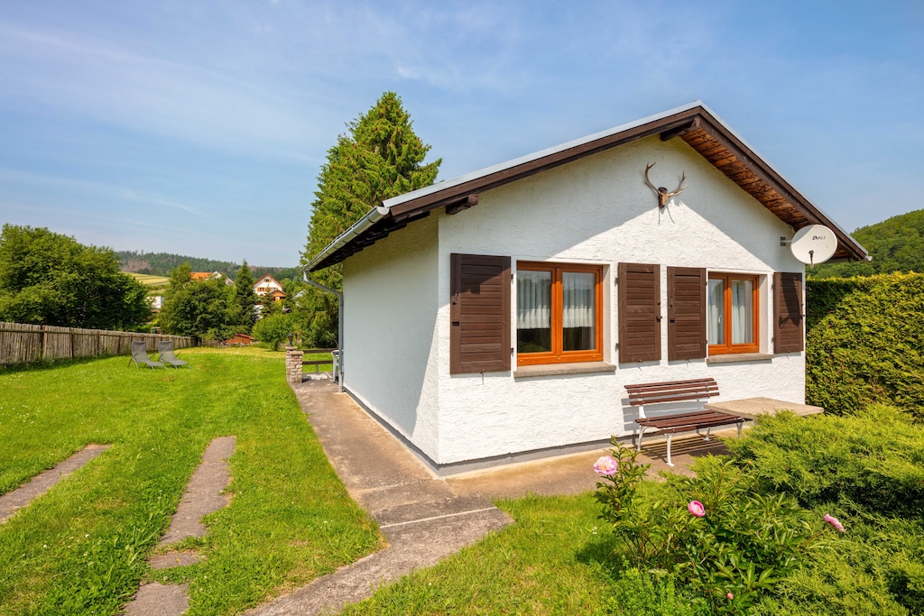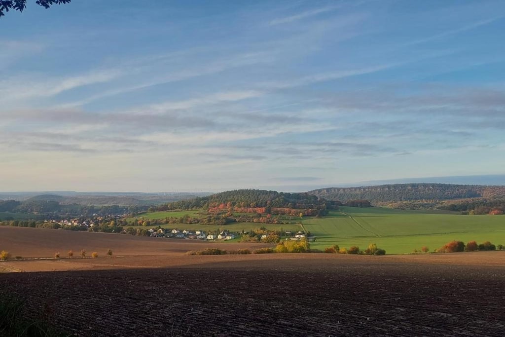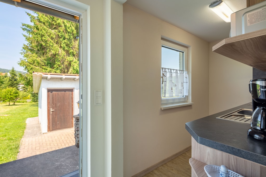 Das Ferienhaus befindet sich in einer wundervollen Alleinlage oberhalb des Ortes mit Ausblick über Wiesen und Hügel. Da das gesamte Tal eine Sackgasse bildet, gibt es überhaupt keinen Durchgangsverkehr. Das riesige Grundstück bietet viel Platz und ist ruhig gelegen (natürlich muss ab und an bei den Nachbarn ein Rasen gemäht werden). Man kann direkt vom Haus aus in den Thüringer Wald und zum Rennsteig spazieren und ist auch recht schnell am Waldbad. Durch die Sitzmöglichkeit vor dem Haus im Osten und auf der Terrasse im Süden hat man immer die richtige Möglichkeit, draußen zu sitzen, und kann zwischen Schatten und Sonne wechseln. Das Ferienhaus ist kein "Leichtbau", sondern ein außergewöhnlich gut und geschmackvoll renoviertes Steinhaus mit Keller, das sogar über eine Klimaanlage zum Kühlen und Heizen verfügt. Die moderne Dusche bietet Platz für zwei. Im Bad waren sogar ein Föhn und eine Handtuchheizung vorhanden. Die Versorgung mit heißem und kaltem Wasser war sehr zuverlässig. Da es kein Trinkwasser ist, wird Mineralwasser sogar kostenlos zur Verfügung gestellt! Die Küche ist mit allem, was man braucht, ausgestattet (beschichtete Pfannen, Edelstahltöpfe etc.). Wer die Schnitzel nicht mit einer der vorhandenen Zangen umdrehen möchte, sollte sich einen Pfannenwender mitbringen. Es gibt einen Herd mit Ofen und Ceranfeld (4 Platten), Mikrowelle, Kaffeemaschine, Toaster, Wasserkocher. Alles hat einwandfrei funktioniert, und das Corona-bedingte Kochen macht hier auf jeden Fall Spaß :-). Das Doppelbett hat zwei weiche Matratzen in der Größe 90 x 190 cm (ohne Fußteil). Für eine Woche haben wir 14 Euro für Strom bezahlt (ohne dass wir die Klimaanlage genützt hätten), was wir sehr günstig fanden. Die Anfahrt über teilweise geschotterte (Feld-)Wege war für uns kein Problem. Wer jedoch ein tiefergelegtes Auto hat, hat eventuell Schwierigkeiten. Die Vermieter sind sehr freundlich, immer erreichbar und hilfsbereit. Wir können das Ferienhaus nur weiterempfehlen!