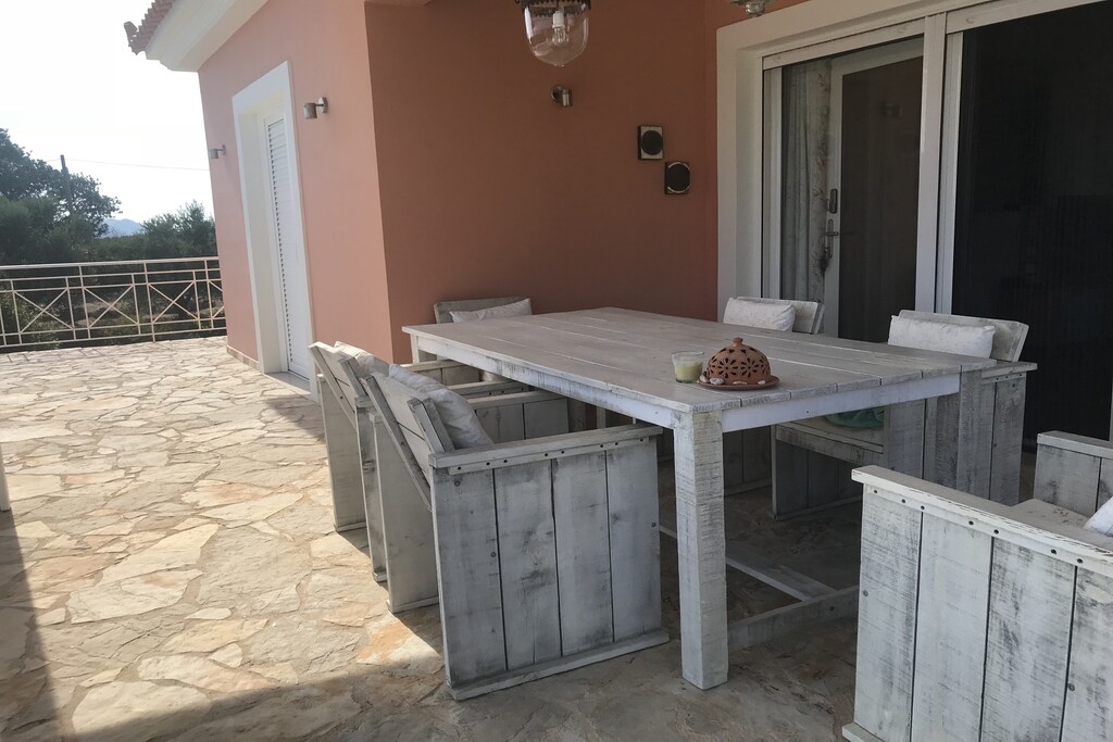 Designed for up to 8 guests, the villa includes a fully equipped kitchen, a spacious living room, and a master bedroom with sea-view terrace access—all on the main floor, along with a guest toilet and bathroom. Upstairs, two en-suite bedrooms lead to a large terrace with sweeping views. Every room is air-conditioned, ensuring a comfortable and luxurious stay.