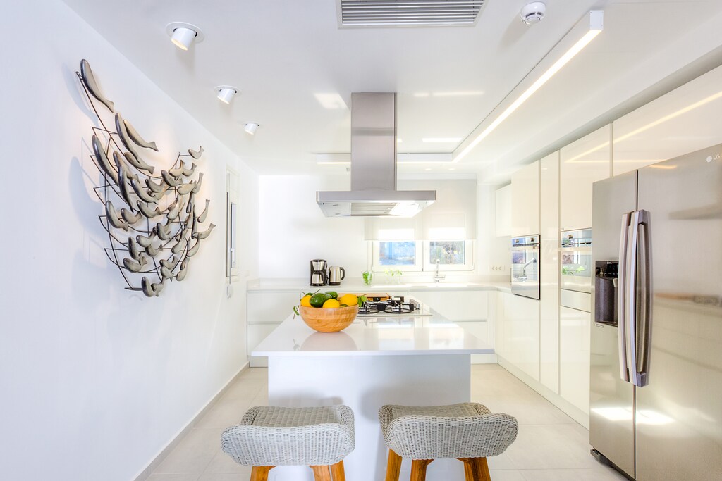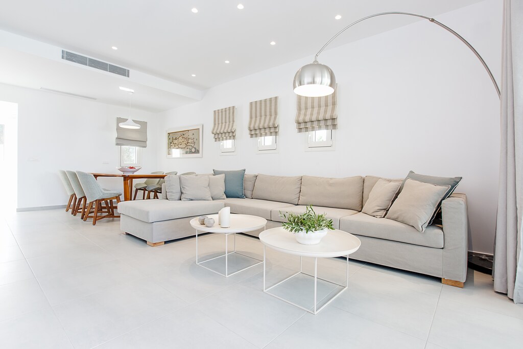 The spacious outside area offers a sun deck with plenty of sun loungers, parasols, a 55m2 heated infinity swimming pool, a bar with BBQ and a professional fridge. There is a large lawn, stone benches and beautiful fire place for romantic evenings in the middle of olive grove and fruit trees. The villa is completely gated and secured with an alarm system, offering both privacy and security.