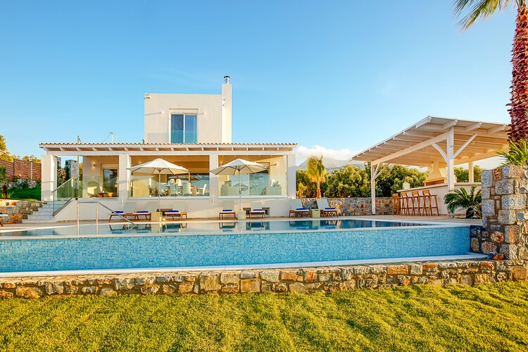 This brand-new villa hides amongst the olive trees just 10 min. walk from a beautiful, well-maintained, sandy beach and the picturesque village of Sisi. Breath-taking views over sea, mountains and olive groves, the villa enjoys complete privacy and yet close to all the local amenities. The villa has 3 floors. Entering on the ground level, a large dining and living area, fully-equipped kitchen. Same level, master bedroom with en suite with both bath and walk-in shower. Bedroom has a private exit to the terrace, pool and shaded veranda. From the living room you can access the veranda and dining area for 12 guests.