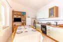 Inside, an open‑plan lounge flows into a fully equipped kitchen fitted with a gas hob, dishwasher, fridge‑freezer, toaster, kettle, coffee maker, and seating for easy family meals. Two modern bathrooms (both with showers and bidets), free Wi‑Fi, TV, washing machine, and a cot for little travellers add everyday convenience, while the shaded outdoor dining area encourages al‑fresco evenings cooled by the coastal breeze.