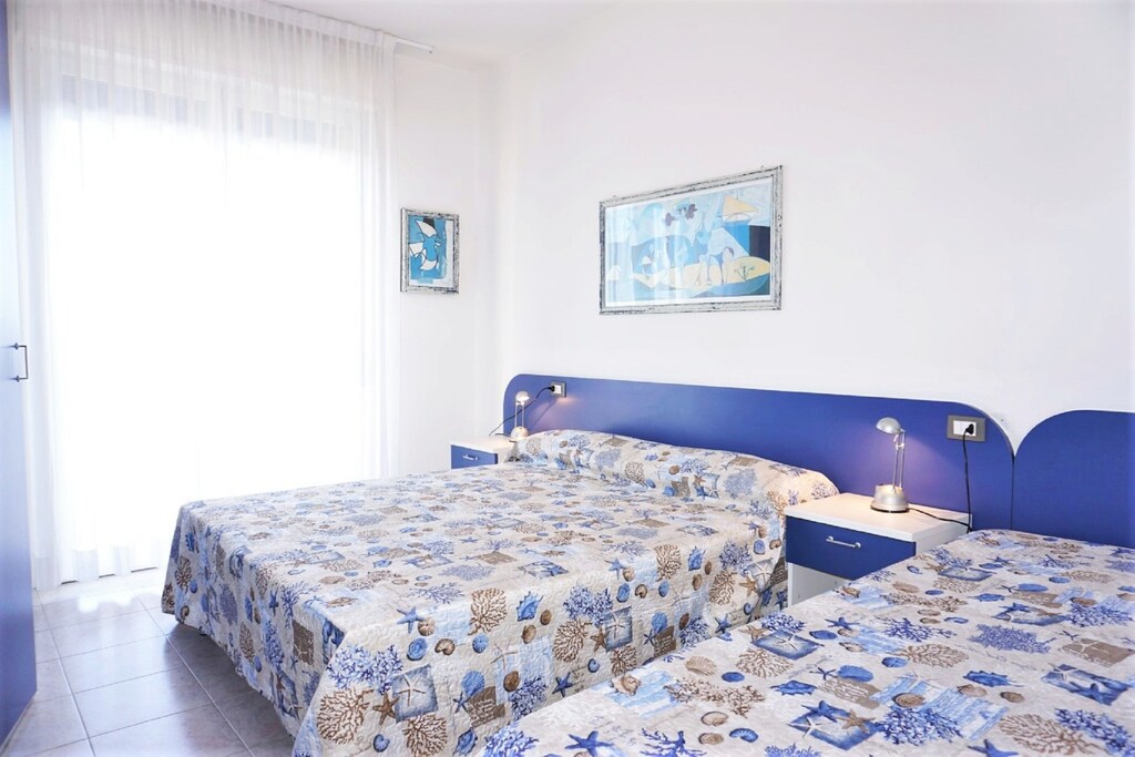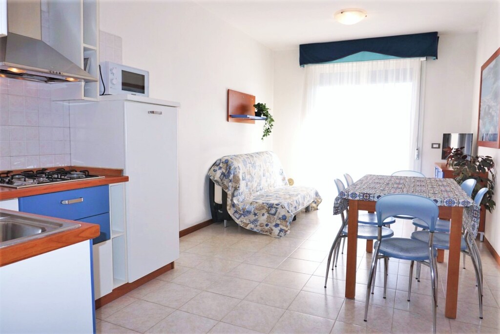 Inside, the apartment features a well-equipped open kitchen where you can prepare your favorite meals. The tastefully furnished interior includes air conditioning to keep you cool on hot summer days. With private parking available at the residence, everything is in place for a relaxing and memorable holiday on the Venetian coast.