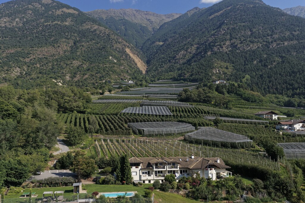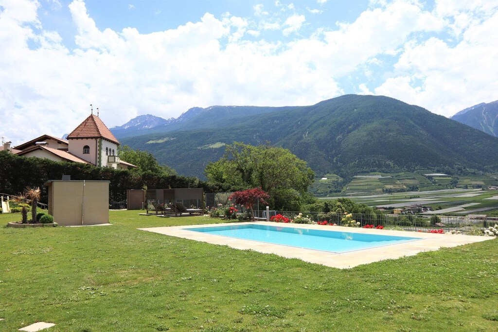 Charming apartment building with an inviting pool area surrounded by numerous orchards and greenery. You are in a quiet, sunny location right at the entrance to Goldrain, a district of Latsch in Vinschgau at 650 meters above sea level. Surrounded by a unique mountain landscape, you can relax in the pool and at the same time enjoy the breathtaking view down the valley. The adventure showers and the relaxation area ensure relaxation. While the little guests can romp around on the playground, you can relax in the sauna (for a fee) or on one of the loungers with an exciting read. The Residence Lahnhof has a registered helipad, where it is possible to land your own helicopter on request.