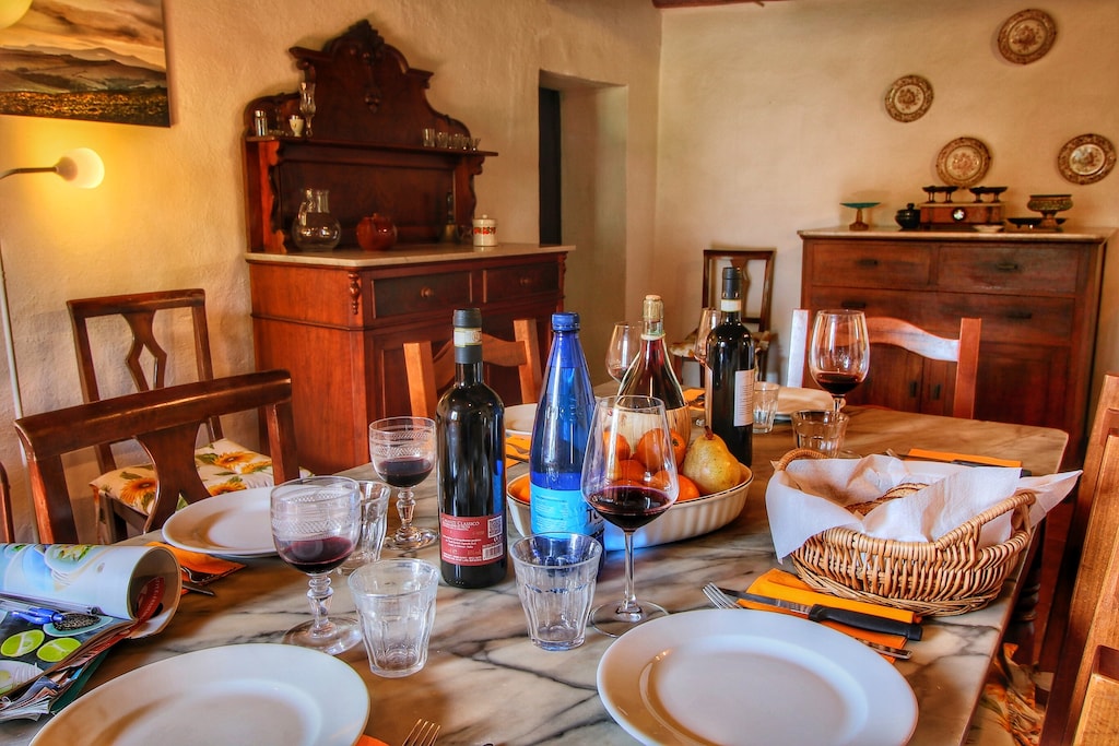 een oude boerderij met authentieke details zoals dat heet. Maar prachtig gelegen. vanaf het terras schitterend uitzicht met in de verte de torens van Siena. Veel wild (reeën, wilde zwijnen, dassen) doordat het een beschermd gebied is. Het huis heeft veel ruimte.