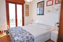 The apartment features two bedrooms, one with a double bed and the other with two bunk beds, making it perfect for families with children or groups of friends. The bathroom is well-appointed with a shower, washbasin, toilet, and bidet. Air conditioning keeps the space cool and inviting throughout the summer.