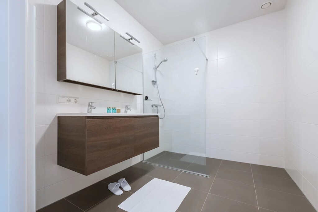 The apartment features three cozy bedrooms, including one with an en-suite bathroom complete with a shower, washbasin, and toilet. The second bathroom, conveniently located in the hallway, also includes a shower, washbasin, and toilet. Whether you're unwinding in the comfort of your bedroom or enjoying the apartment’s amenities, you’ll feel right at home.