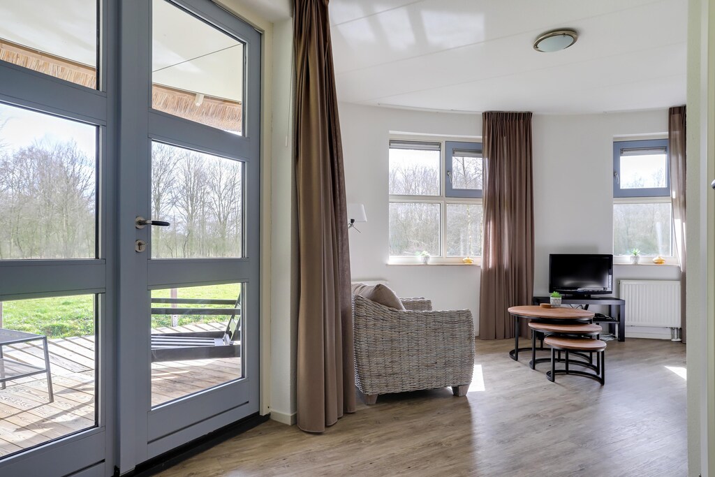 You reach the terrace with a large table and 6 chairs through the patio doors. Enjoy a good book from the two luxurious chairs on the veranda and operate the swivel system with your own hands for a unique experience. So you can enjoy a sunny terrace all day long! There is a spacious garden around the house. The house has a thatched roof and dogs are welcome.