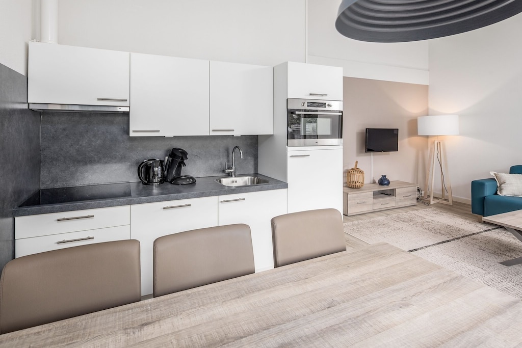 Inside, the open-plan kitchen is fully equipped with modern appliances, including a dishwasher and microwave. The living room, complete with a TV, provides a welcoming space for relaxation. The home is designed for comfort, making it an excellent choice for a seaside getaway.