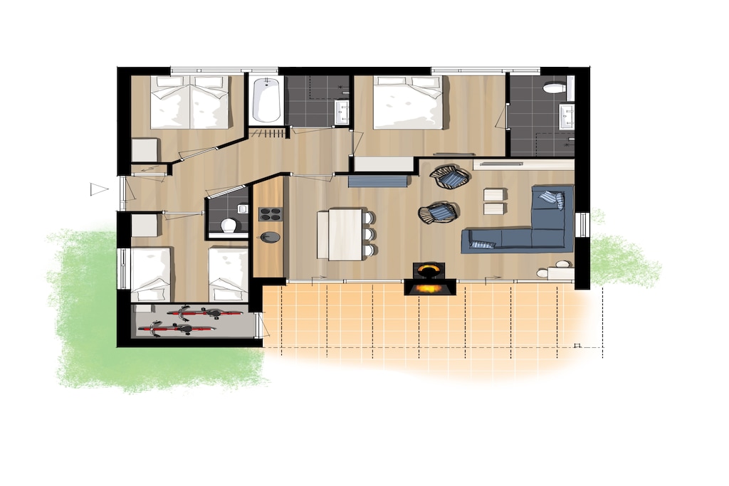 This stunning beach villa epitomises exactly what you are coming for; a beach holiday! You will stay in a beautifully designed accommodation with attractive furnishings in which you will immediately feel at home. The living room with fully equipped, open kitchen invites you to spend time together. The beautiful sitting area and wood-burning stove make an important contribution to this. You have three bedrooms, one of which has an en-suite bathroom, with comfortable beds. The two bathrooms are modern and equipped with a rain shower. One even has a bathtub.