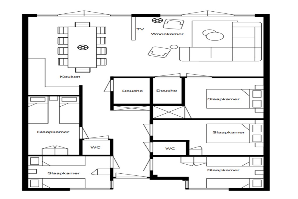 This fully furnished bungalow offers a spacious and comfortable stay for up to 10 people. The bungalow features a large living room with an open kitchen, creating an inviting space for relaxation and meals. The living room is equipped with standard appliances, including a flat-screen TV, DVD player, and radio CD player, ensuring entertainment during your stay. The open kitchen is well-equipped with a four-ring stove, refrigerator with freezer compartment, coffee machine, combination microwave, dishwasher, and water heater, making it easy to prepare meals for your group.