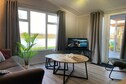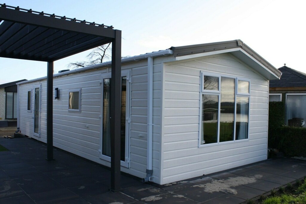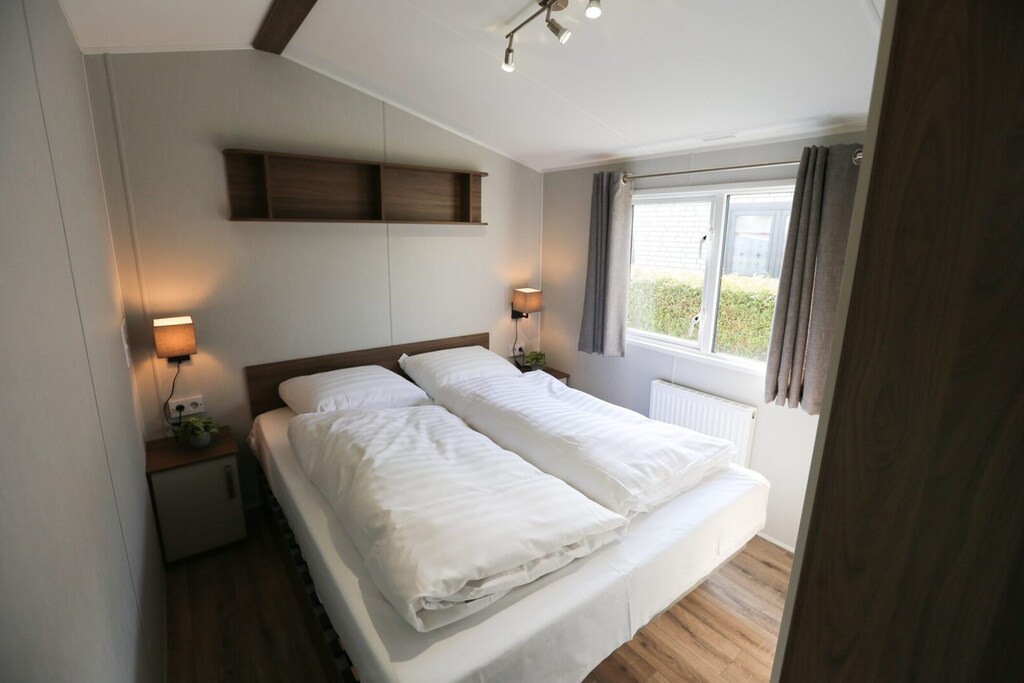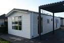 The chalet features two cozy bedrooms: one with a double bed and the other with two single beds, providing flexible sleeping arrangements for guests. The bathroom includes a shower and toilet for your convenience. Patio doors lead out to a lovely terrace, where you can enjoy the outdoor space and relax under the canopy with a comfortable lounge set.