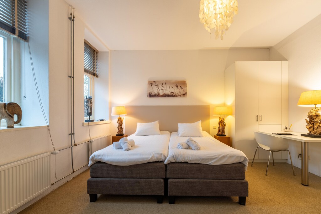 This unique group accommodation on the edge of the Veluwe, near Teuge Airport, is perfect for family gatherings, friends' getaways, or multi-day training sessions. The accommodation offers 12 spacious, beautifully styled bedrooms, each with its own spacious bathroom. Because there are four bedrooms on the ground floor, the house is also very suitable for care groups. Guests can enjoy the garden, spot parachutists landing from the nearby airport, or explore local attractions such as Paleis 't Loo, Apenheul Primate Park, and nearby golf courses. The holiday home is reserved exclusively for your group; there are no other guests on the property.