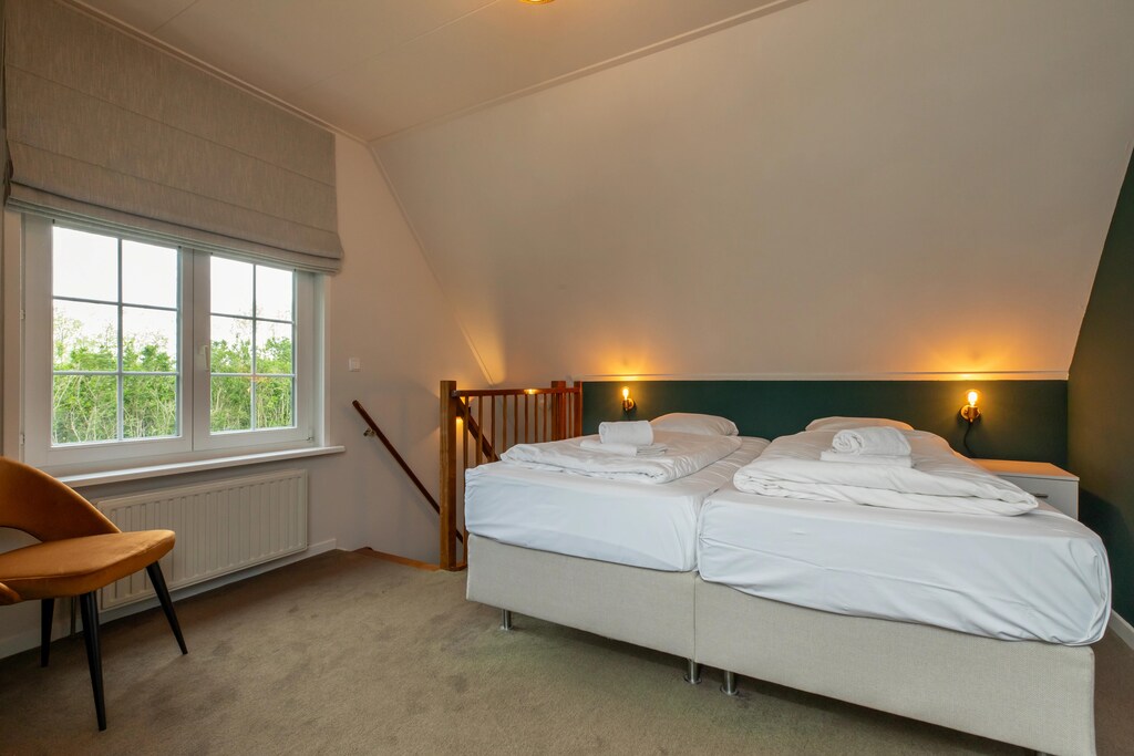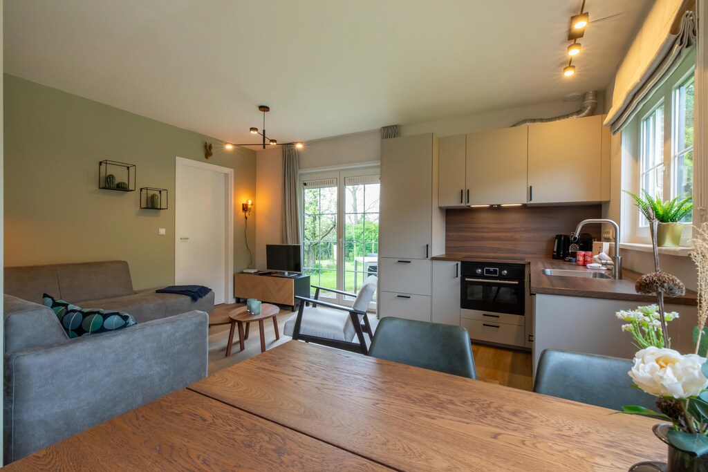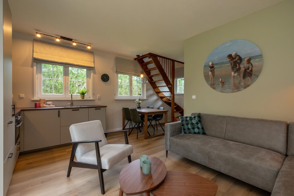 A cozy 4-person apartment with a spacious seating area with patio doors to the large garden, dining area and kitchen. From this room you can reach the double bedroom upstairs (with sink) and the double bedroom downstairs. The bathroom with toilet, sink and toilet is on the ground floor. The kitchen is fully equipped with a dishwasher and a small oven. A camping bed, high chair and stair gate are available.