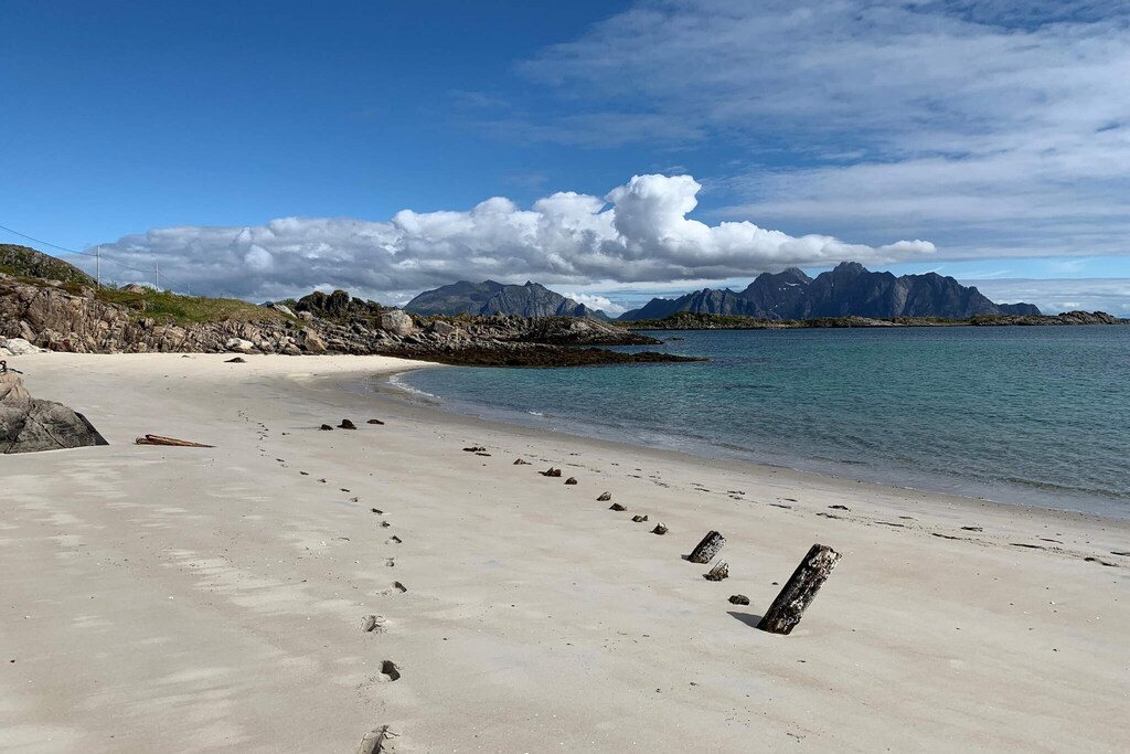 Cozy holiday home in an open landscape furthest north on Vestvågøya. Panoramic sea views and beautiful Lofoten landscape. Child-friendly outdoor area. Ideal starting point for day trips by car around Lofoten. The house was built in 1956 and renovated in 2014. All 4 bedrooms are on the attic; 2 bedrooms with double beds, one bedroom with 2 single beds and one bedroom with one single bed. Living room with a wood stove to provide comfortable heat on cold days and TV with international channels. With its central location in the middle of Lofoten, the house is an ideal starting point for day trips around Lofoten. From the house you can also hike up into the mountains. From the mountain tops, there are magnificent views of the sea and the many Lofoten islands. The house is located in a quiet area with child-friendly outdoor area. Magnificent view towards Lofoten's beautiful coastal landscape, and the mountains Limstrandtinden and Havern 808 masl. On beautiful spring and summer evenings, the midnight sun is a great sight. In winter, the northern lights in the polar sky are a great experience. On Gimsøya are beautiful sandy beaches and golf course and the idyllic Haukelandsstranda is located on the west side of Vestvågøya. 15 km to the grocery store. 30 km to Leknes with shops, restaurants and airport. 20 km to Lyngvær with boat rental. In winter, the car must be parked 200 m from the house.