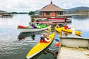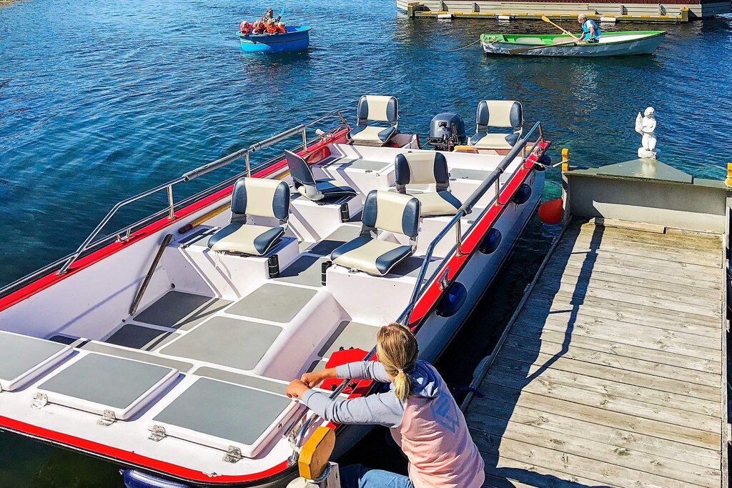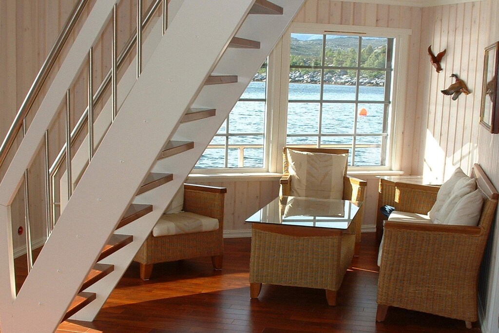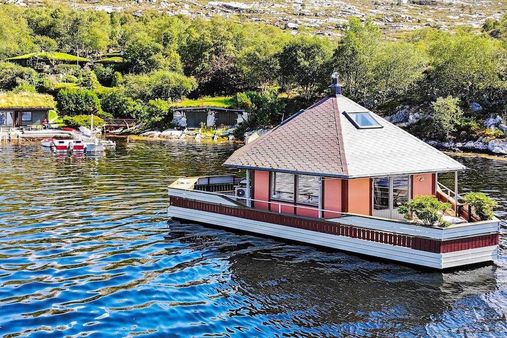 This is one of two floating holiday cottages that are rented out in Norway, the other is 38508. Finally you can live on the water and in a cottage at the same time! The house is anchored up and sits completely still in a large bay, protected against stormy weather. It weighs 23 tons and sits safely on the 63 ton floats. The unique triangular construction gives it stability. The cottage has two floors and is spacious both inside and outside. A few strokes of an oar away, with one of the two boats that are included with the cottage, you have a space on dry land for barbecuing, swimming and outdoor games like badminton and croquet. The cottage has a 50 m² open and covered terrace, divided between three verandas on each corner and connected with covered walkways. One side has a floating dock for easy access with boat. The cottage is environmentally friendly with no encroachments in nature. All doors have portlights. The bathroom has its own outdoor exit. The kitchen is functional and the stove runs on gas. The heat pump can be used as air condition in summer. The living room is elegantly furnished with large glass surfaces, and a gas fire place for cool days. TV, Chromecast. One bedroom is equipped with a veranda window. Access to washing machine on land. Jump in the water directly from the terrace (a ladder for getting back up) or swim in the shallow waters near land, 50 meters away. 3 crab traps, 1 fish net and 4 bicycles are at your disposal. Canoes for 2 and 3 people are shared with the other cottage. Life jackets are included. Good fishing conditions all year around in closed or open water. A private fish cleaning table is at your disposal. A lake with small trout is 3 km away. 8 km to Kalvåg, the largest and best preserved fishing village in Western Norway. 14 km to Grotlesanden, one of Norway's finest beaches. No letting to sport fisher groups. The owner of the boats demands when using his boats every guests needs to use a life jacket, and if any of the jackets is not suitable for any reasons, the guests need to carry their own life jackets. The owner provides life jackets up to 100 kg.