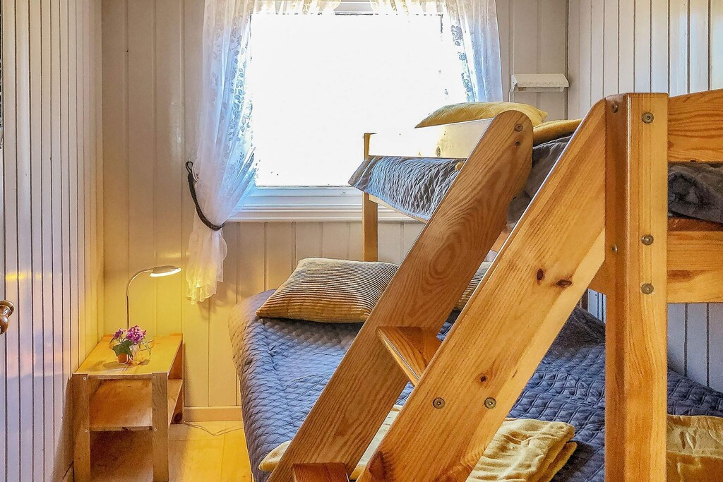 This holiday cottage is located in Ramsjord, close to Korshamn. Sitting on a hilltop, you have a view of a lake, the sea and magnificent scenery. The facilities of the house includes a satellite dish with several German TV-channels. Child-friendly yard. You can fry your own catch on the outdoor grill on the terrace. You can go swimming in the lake 50 metres from the cottage and enjoy the sauna (shared with unit 29029). Down by the sea 600 metres away there is a boat house where you can store fishing equipment and gut the fish. Three motorboats are available for rent here (shared with another unit). Make sure to order the boats in advance and with confirmation. Korshamn is famous for its excellent fishing conditions all year around. If you wish to go on excursions, visit Lyngdal with its shopping facilities and tourist information. Unit 29029 is located very close. Sørlandsbadet, the largest water world of the region, is only a 15 minute drive away. The bedroom with 2 bunkbeds has a 120 cm wide bed below and a single bed on top.