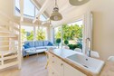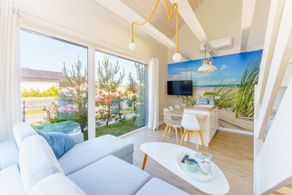 Comfortable, two-story houses with air conditioning (with cooling and heating functions). They provide comfortable rest for 8 people. On the ground floor there is a spacious living room combined with a well-equipped kitchen, as well as a double bedroom, a bathroom with a shower (there is a washing machine) and a private sauna. On the first floor there is a second bedroom. The terrace is equipped with a grill, garden furniture, a screen and deckchairs. Wireless Internet is available. Towels on request (for an additional fee).